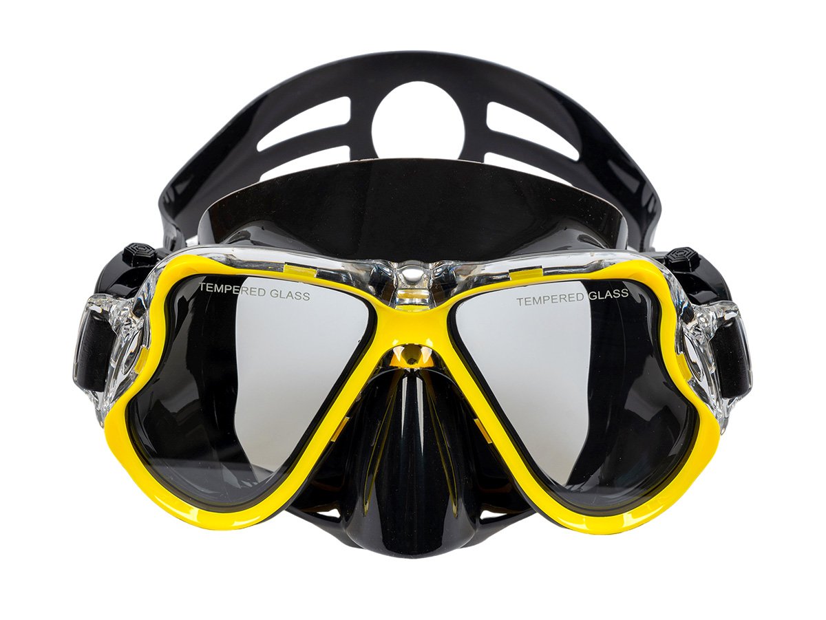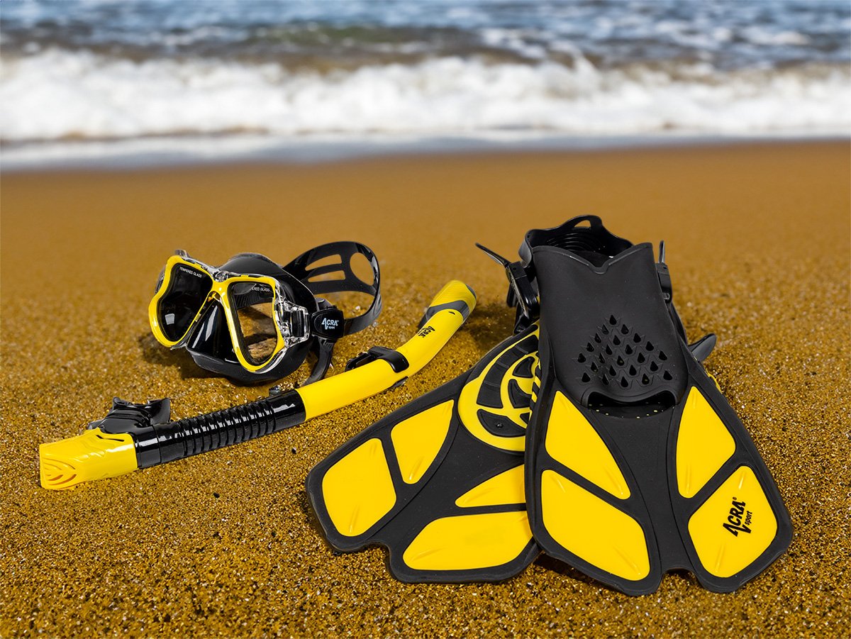Snorkelling set Acra M6102, 3in1, yellow Acra Sport snorkel set with adjustable fins, tempered glass mask with two visors, Dry Top silicone snorkel and travel gear bag.