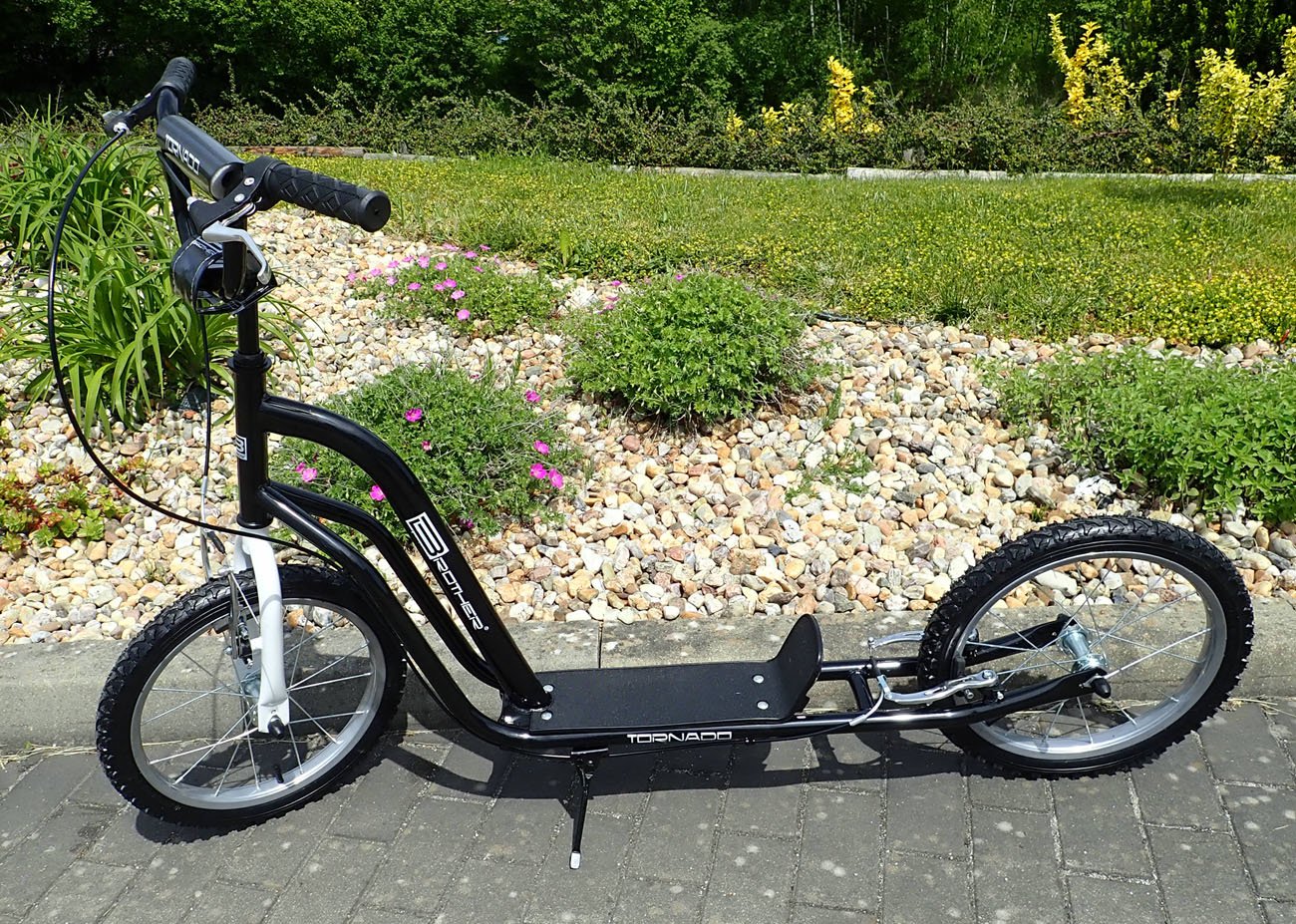 Scooter for children and adults. Recommended from 9 years old, load capacity 90 kg. Hi-tech reinforced steel frame. Tyres 16" + 16" inflatable rims - Alu treated.
