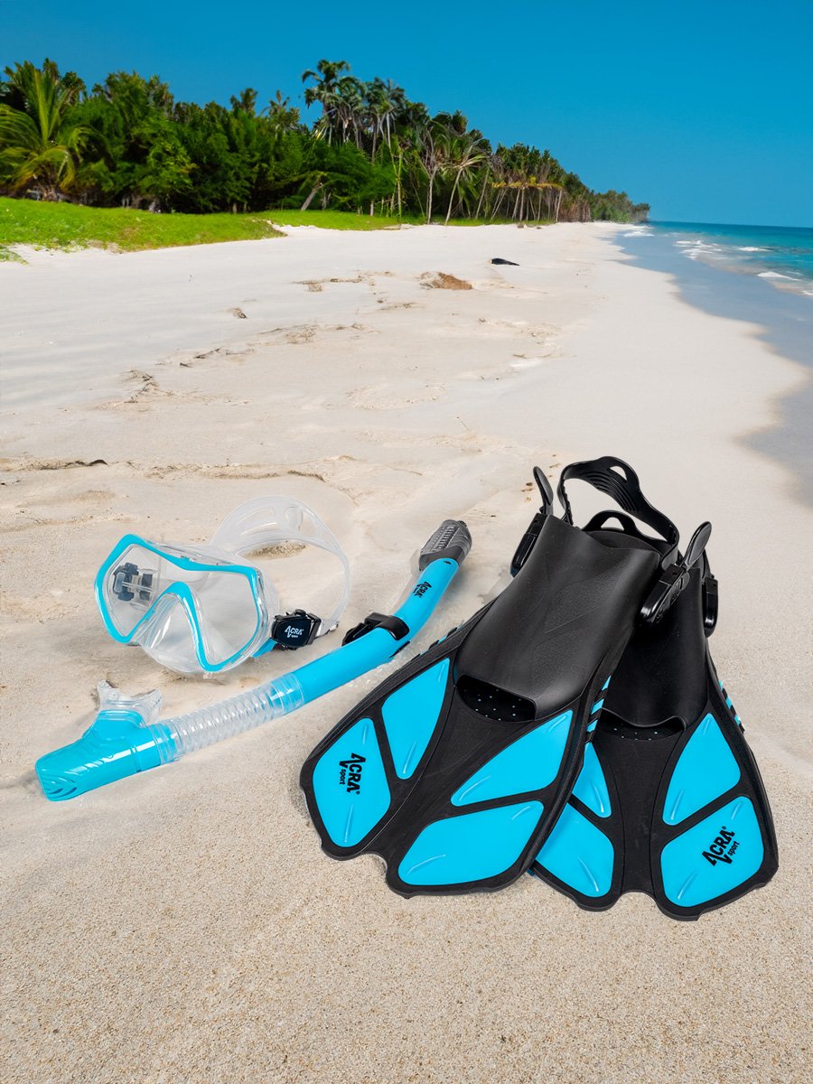 Snorkelling set Acra M6102, 3in1, turquoise Acra Sport snorkel set with adjustable fins, tempered glass mask with two visors, Dry Top silicone snorkel and travel gear bag.