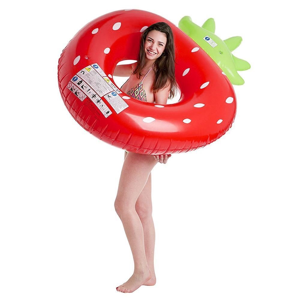 Look: The float is shaped like a strawberry with green leaves on the top.Color: Red, white and green.Suitable for: children from 14 years old.Weight capacity: 79,4 kg.