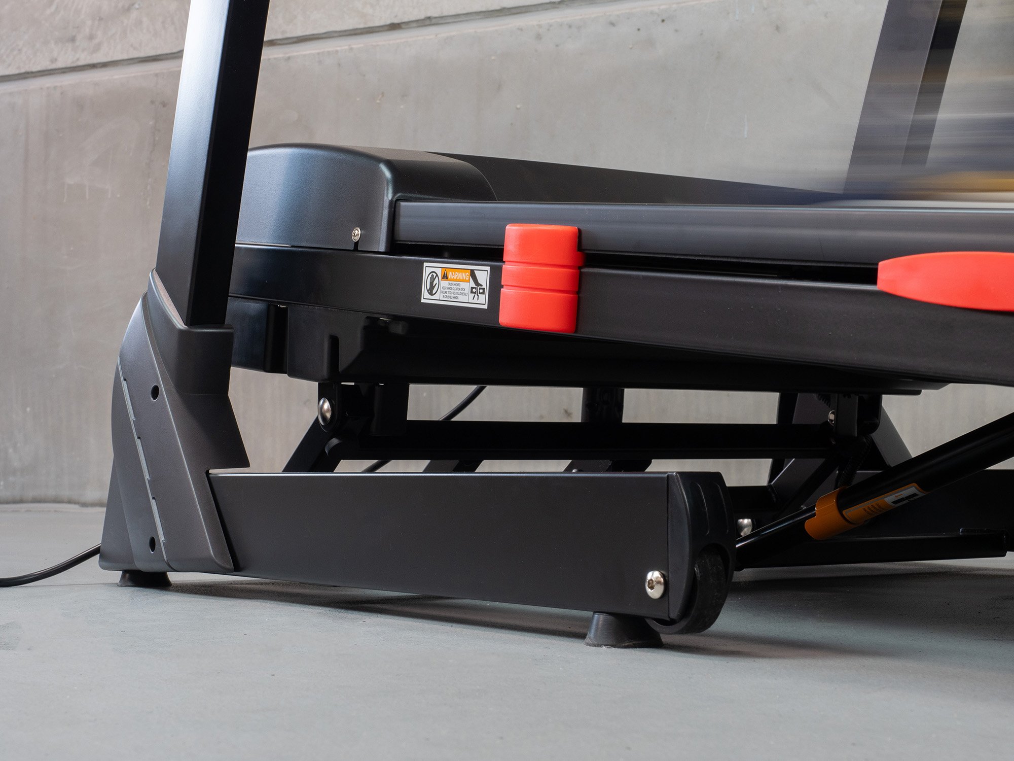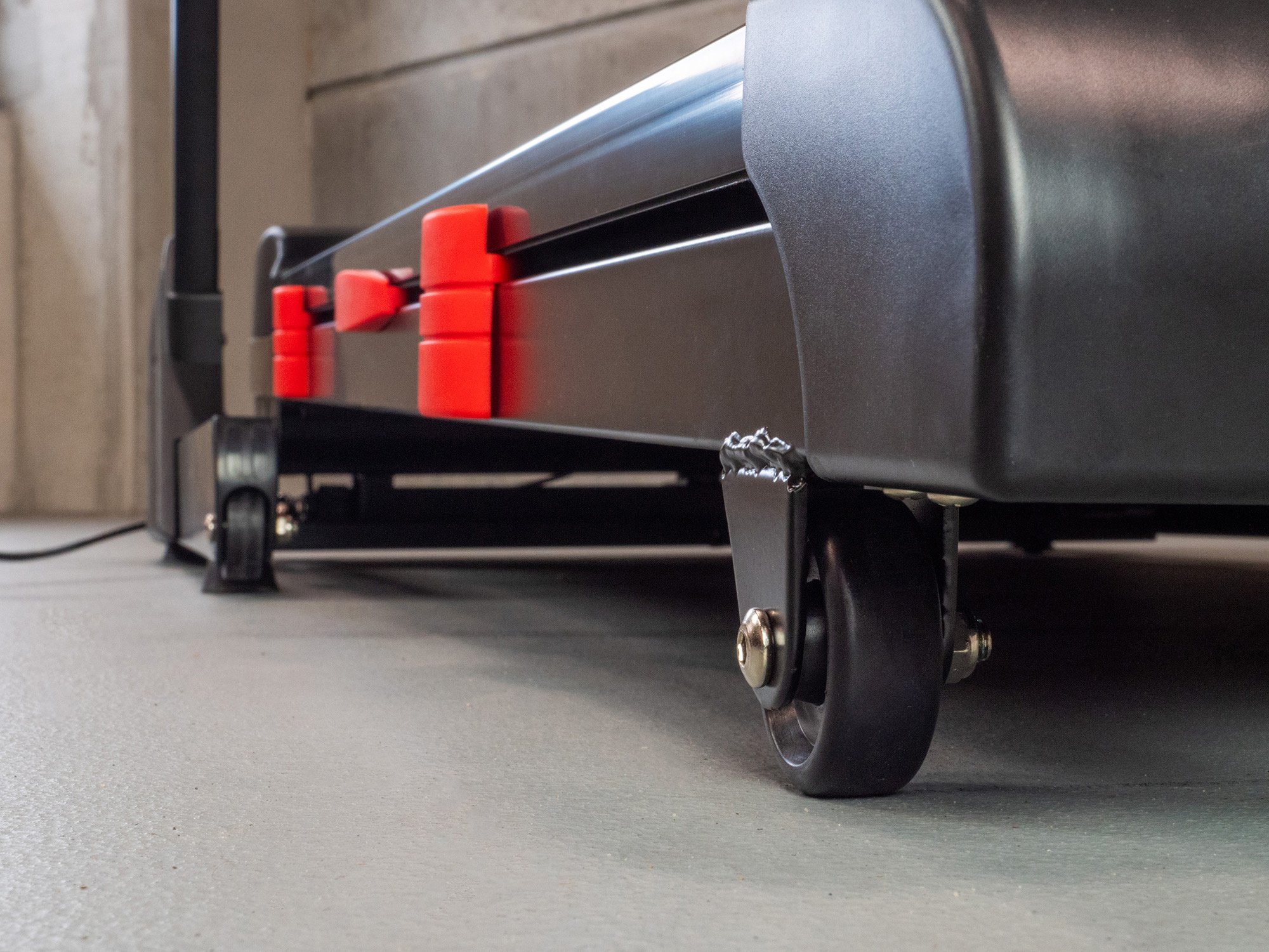 Für eine sparsame Lagerung kann das Laufteil zwischen den Griffen angehoben und dank der Rollen leicht in die Lagerposition gebracht werden.