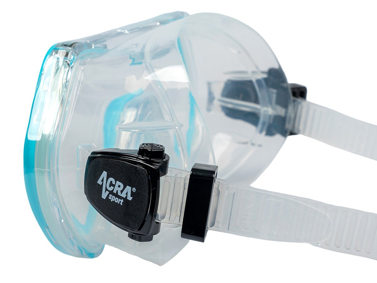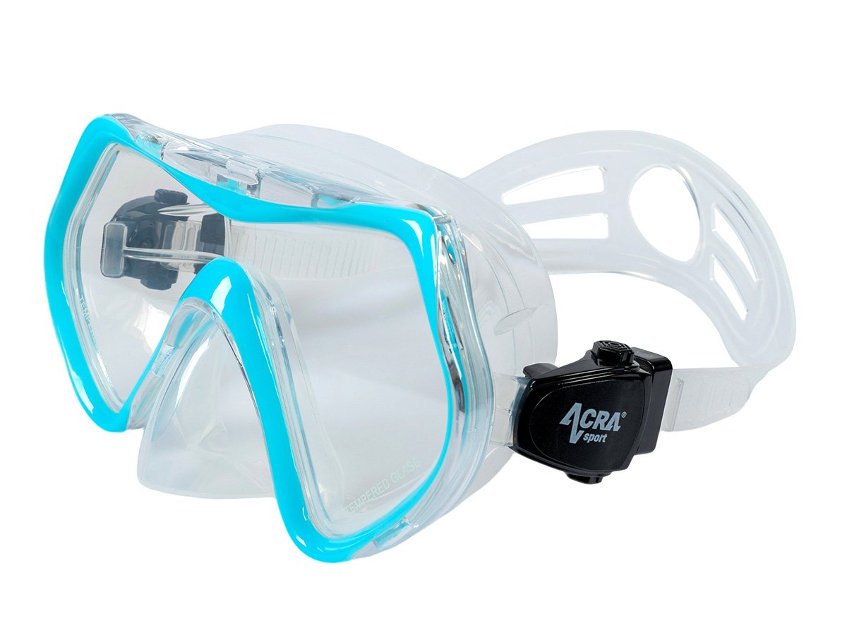 Snorkel Snorkel Mask with Panoramic View: 180° HD Panoramic View. Constructed of four panoramic view windows with a tempered glass visor and hypoallergenic silicone liner, the Acra Sport snorkel mask withstands underwater pressure while diving and snorkeling and offers maximum comfort. The diving mask's hem is made of soft and flexible silicone, and the food-grade silicone mouthpiece is secure, creating a watertight seal with each driver's face and attaching perfectly to the mouth with no particular odor.