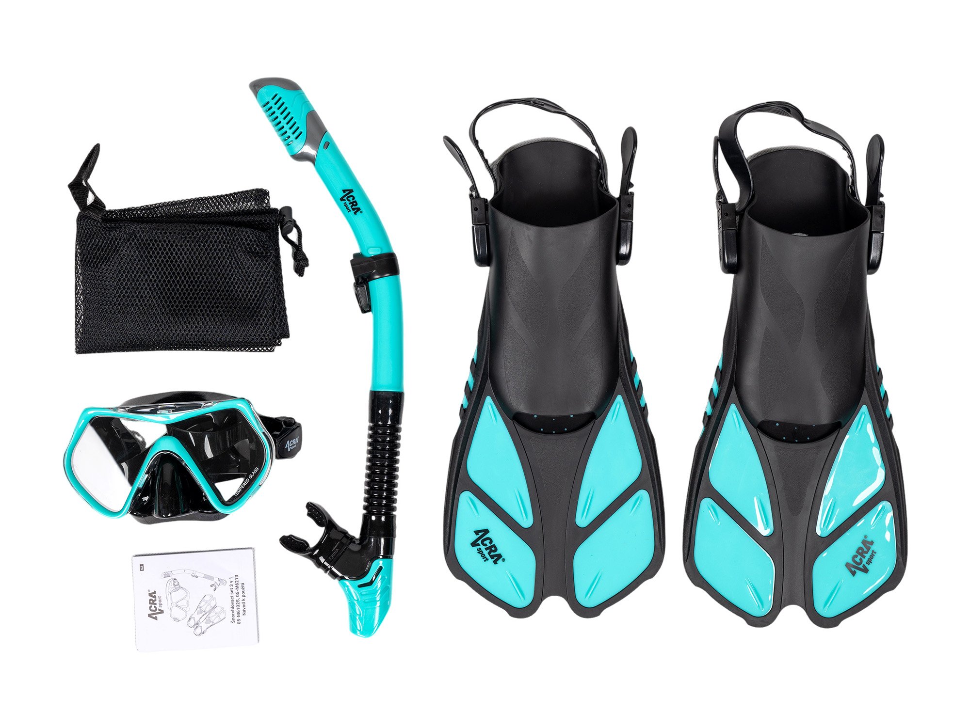 Acra Sport snorkel set with adjustable fins, tempered glass mask with two visors, Dry Top silicone snorkel and travel gear bag. The Acra snorkel set is the perfect travel companion and is suitable for snorkeling, swimming, diving and much more.