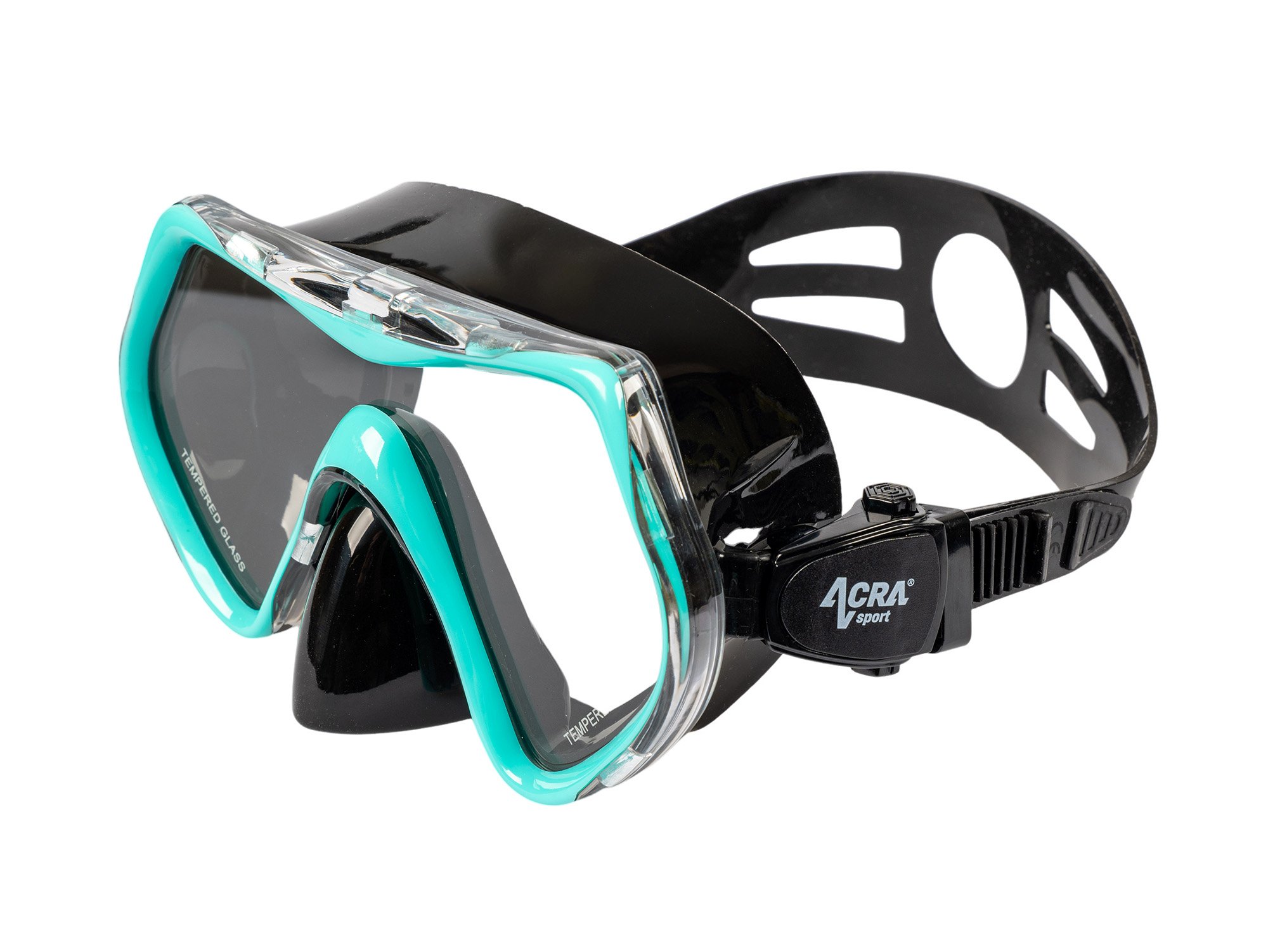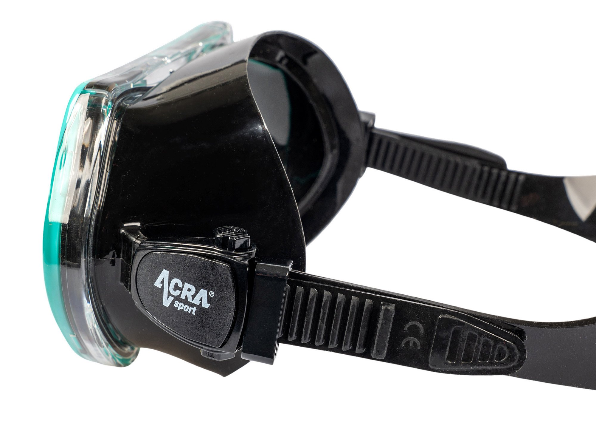 Snorkel Snorkel Mask with Panoramic View: 180° HD Panoramic View. Constructed of four panoramic view windows with a tempered glass visor and hypoallergenic silicone liner, the Acra Sport snorkel mask withstands underwater pressure while diving and snorkeling and offers maximum comfort. The snorkel mask's hem is made of soft and flexible silicone, and the food-grade silicone mouthpiece is secure, creating a watertight seal with each driver's face and attaching perfectly to the mouth with no particular odor.