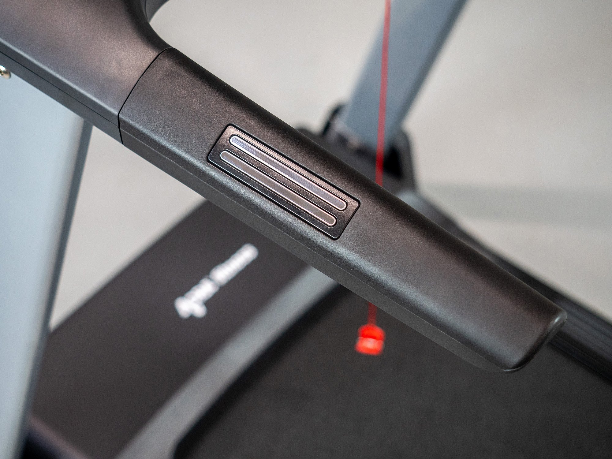 The belt is powered by a 2.0 HP constant speed electric motor and allows for speed adjustment from 1-18 km/h. The control panel is equipped with handles with heart rate sensors and load control.