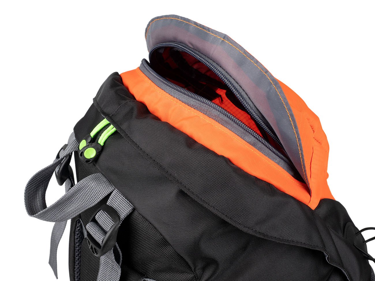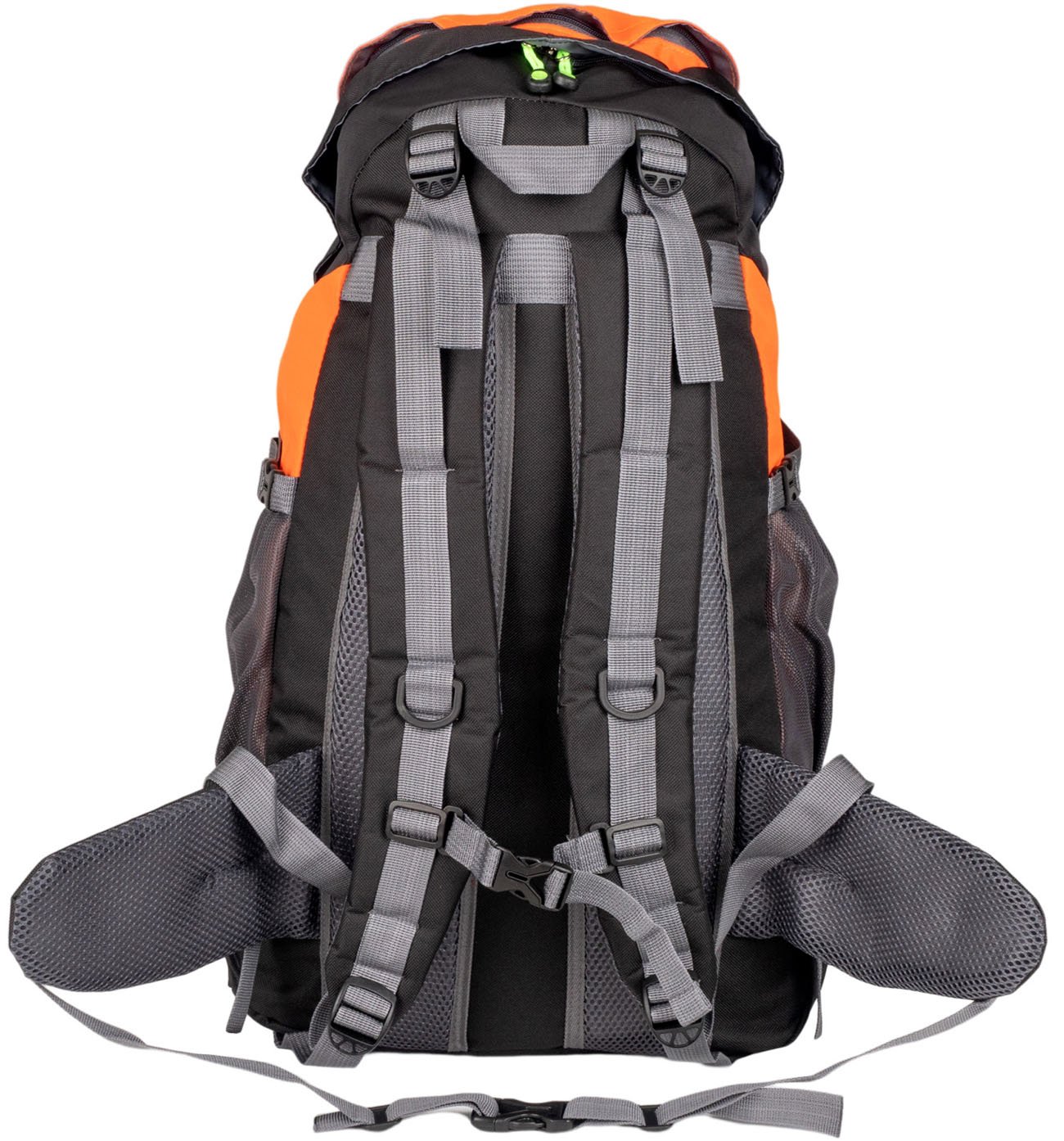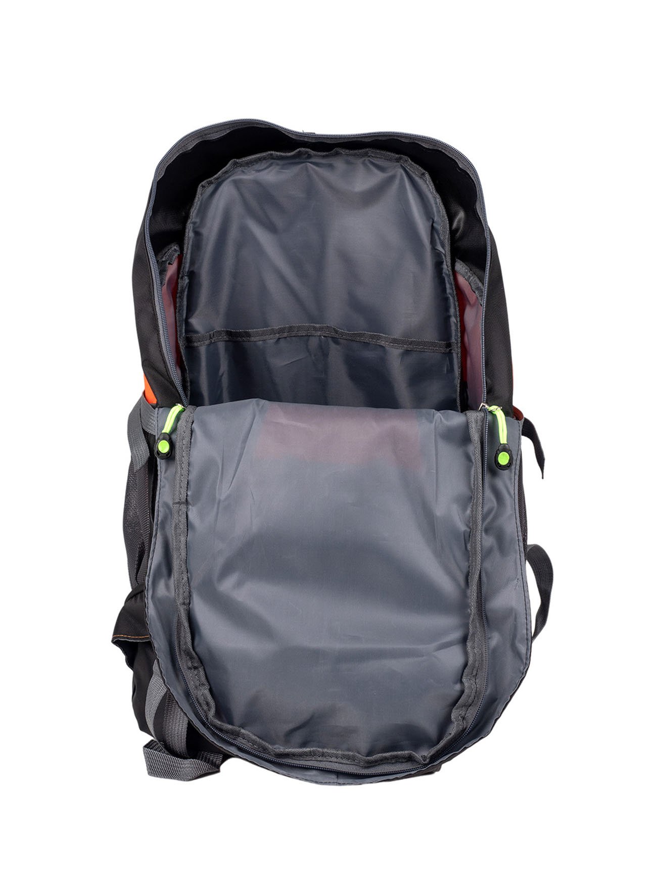the pack has 2 main compartments with top entry with double-sided zippers, 2 mesh pockets on the sides of the pack, a front open pocket and a handle for easy carrying on the top of the pack
