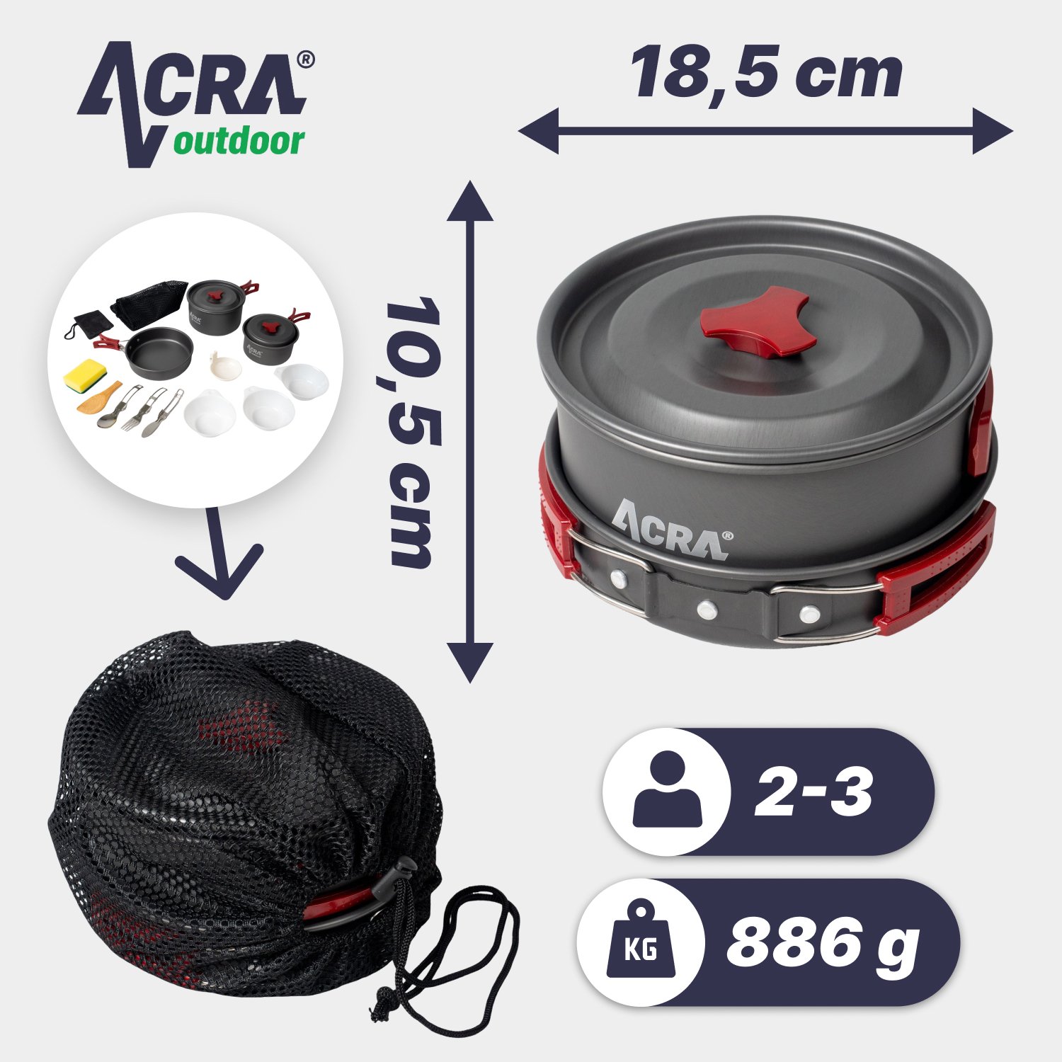 KLightweight Acra C21 Cookware Set: Cooking on the go for up to 3 people!Are you looking for practical and compact cookware that will make it easy to prepare meals on your hiking and camping trips with friends? Then the ultra-lightweight Acra C21 cookware set from Acra Sport is the perfect choice! The set contains everything you need to cook for up to 3 people and is made of durable and lightweight materials that make it easy to carry. Main Features: Compact and compact design. Practical folding handle: The casseroles and bowls have a folding handle that saves space and allows for convenient handling. Quick Heating of Food: The aluminum surface of the cookware ensures fast and even heating of food. Durable Materials:The set is made of durable aluminum alloy and plastic, so it can withstand the harsh outdoor conditions. Hard anodized coating - Durable and easy to clean Set contents:- 1x 1.4L casserole- 1x 0.6L casserole- 1x 0.6L frying pan- 2x lids- 3x plastic bowls- 1x plastic ladle- 1x bamboo spatula- 1x folding fork/spoon/knife- 1x sponge for washing- 1x mesh wrapperDimensions: 18.5 x 18.5 x 10.5 cm Weight: 886 g The Acra C21 ultra-lightweight cookware set is ideal for those who value practicality, light weight and durability. It is perfect for hiking, camping, picnicking and other outdoor activities with friends. Tip.