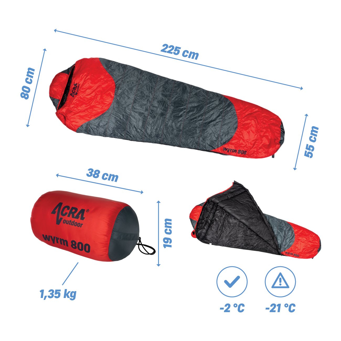 Acra Wyrm 800 is a great sleeping bag for all demanding users who want to enjoy a comfortable sleep in the outdoors even in the most challenging conditions. Its mummy cut, quality duck down insulation, extended length and durable material make it ideal for camping, hiking, climbing and other outdoor activities.