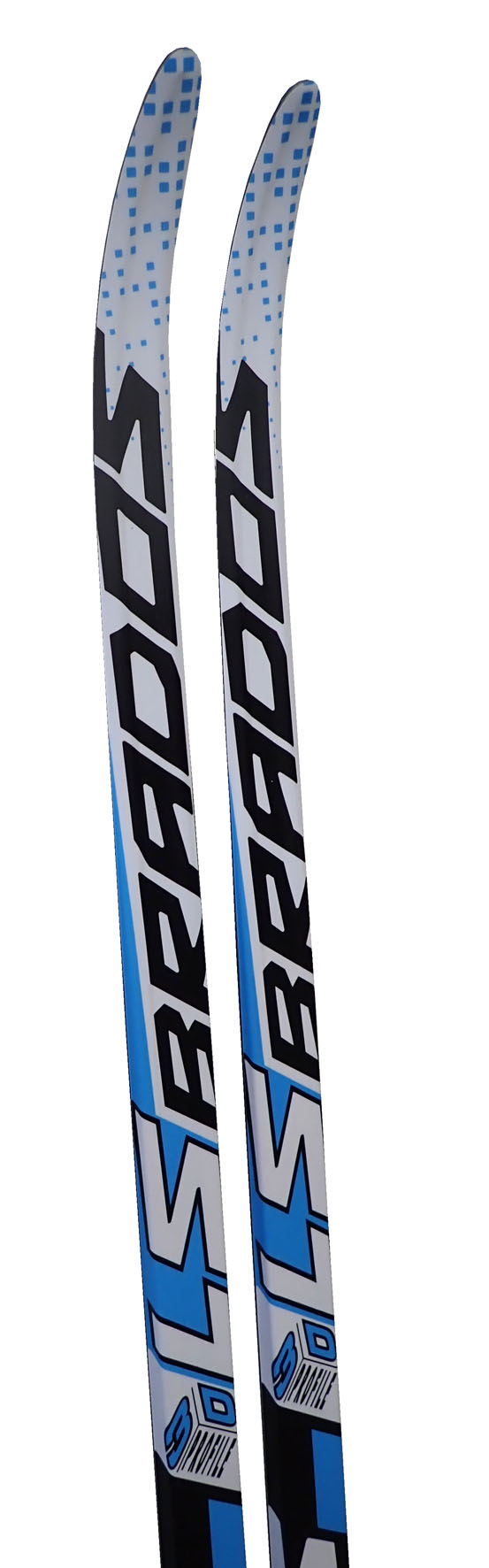 Quality cross-country skis Brados with wooden core in length 160 cm and with mounted bindings of Salomon SNS system.