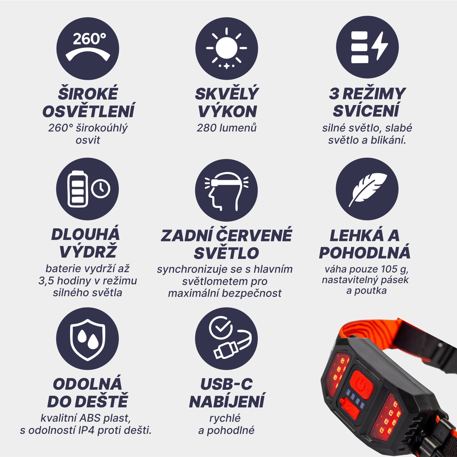 Impressive and wide-angle illumination: With an innovative COB (Chip-on-Board) light source, the headlamp provides 260-degree wide-angle illumination for excellent peripheral vision and a clear view of your surroundings. With a brightness of 280 lumens, you are sure to see everything you need to see. No more dark edges in your field of vision!Selectable light modes for every situation: The headlamp offers three light modes: strong light, weak light and blinking. Easily switch between modes by pressing the main switch, allowing you to adjust the light intensity to your current needs. The rear red light synchronizes with the main headlight for added safety, great for things like moving around on the road or camping at night.Integrated long-life rechargeable battery with status indicator: It features a built-in 1000 mAh lithium polymer battery. In strong light mode, it can last up to 3.5 hours. Charging is quick and easy with a USB cable with Type-C connector. The charging light flashes blue and glows blue when fully charged. The display shows real-time power status while charging via USB, so you always know how much power you have left. To preserve battery life, it is recommended to charge it at least once a month when not in use.Lightweight, durable and comfortable: Weighing only 105g and measuring 19 x 2.5cm, the headlamp is extremely lightweight and comfortable to carry for extended periods of time. Made of durable ABS material that provides high impact resistance. An adjustable clasp with two loops makes it easy to customize for maximum wearing comfort.Waterproof for everyday use: The headlamp has an IP4 rating, which means it is waterproof for everyday use and can handle rain or moisture. However, it is not designed to be immersed directly in water.With the ACRA Outdoor 05-LAMP1 Headlamp, you get a reliable, powerful and comfortable helper for all your adventures and everyday needs in the dark and gloom.