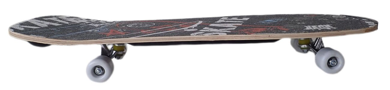 Skateboard coloured - black Flat shape with oval board and curved end of the board at the back. At the bottom of the rear of the skateboard is a plastic oval serving as a brake…