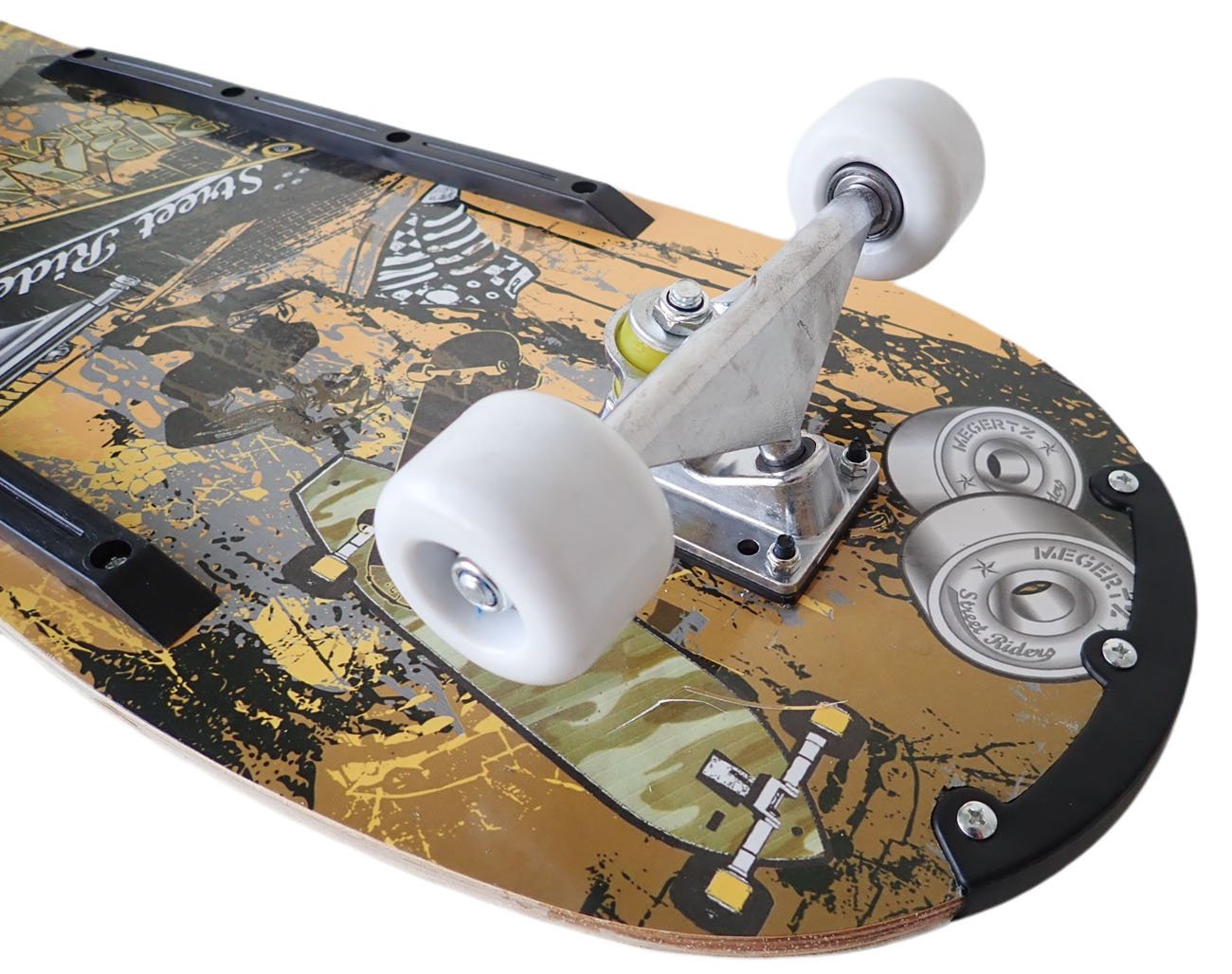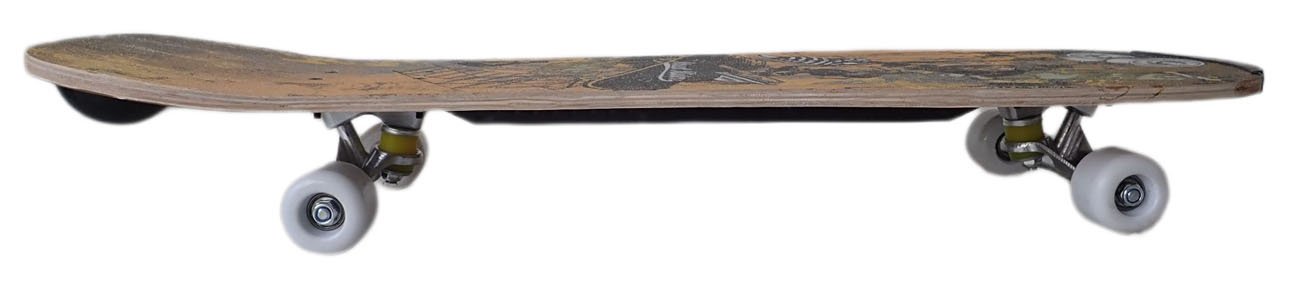 Skateboard coloured - yellow Flat shape with oval board and curved end of the board at the back. At the bottom of the rear of the skateboard is a plastic oval serving as a brake…