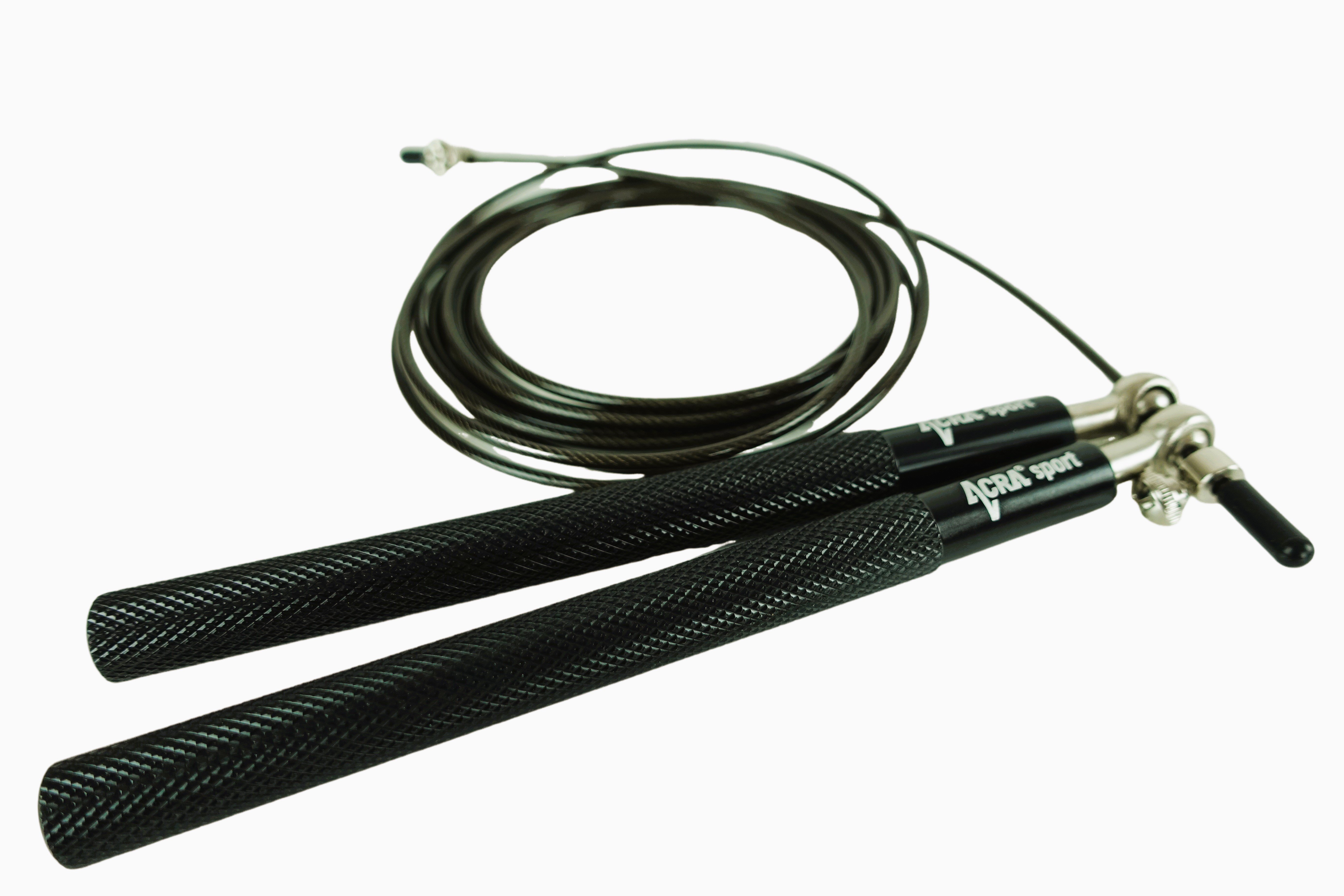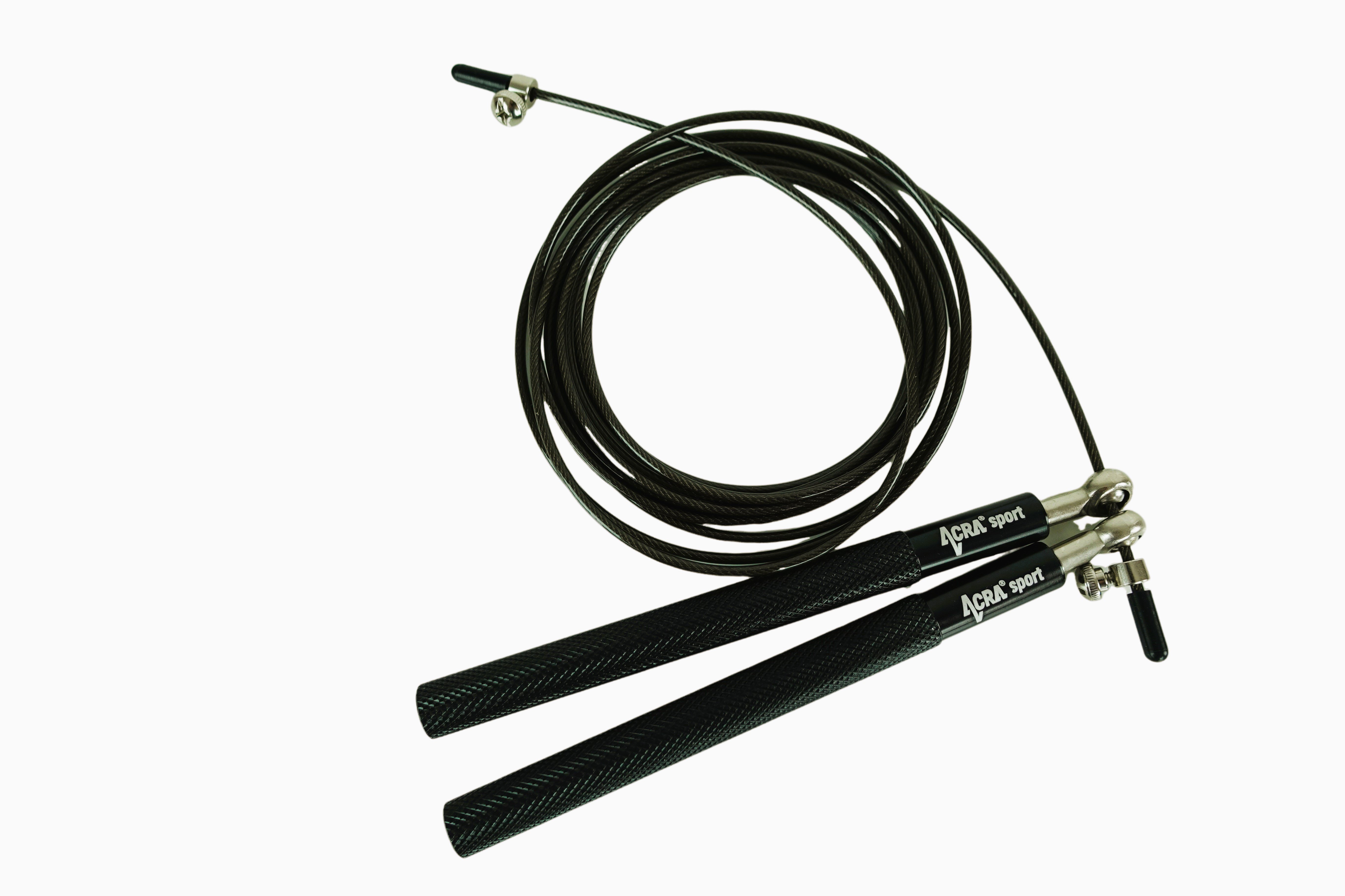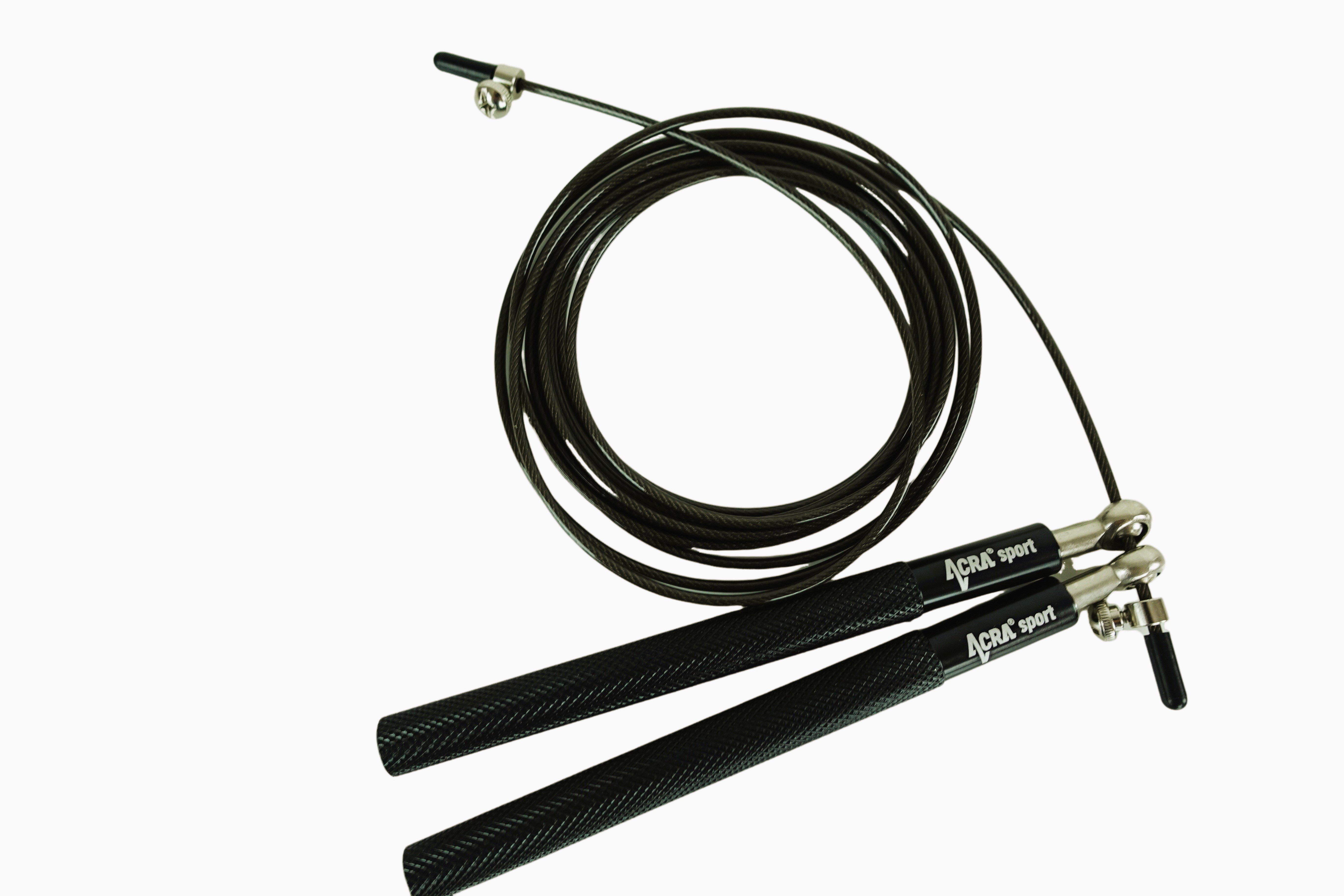 The Acra Black Skipy is an excellent exercise tool for improving overall fitness. The handles, which are made of solid aluminum, have a non-slip surface, ensuring a secure and comfortable fit. The metal swivel bearings with tightening screw allow easy adjustment of the length of the cable as required. The lanyard itself has a steel core protected by a rubber bungee, and is finished with rubber removable sleeves that allow for precise shortening of the jump rope.