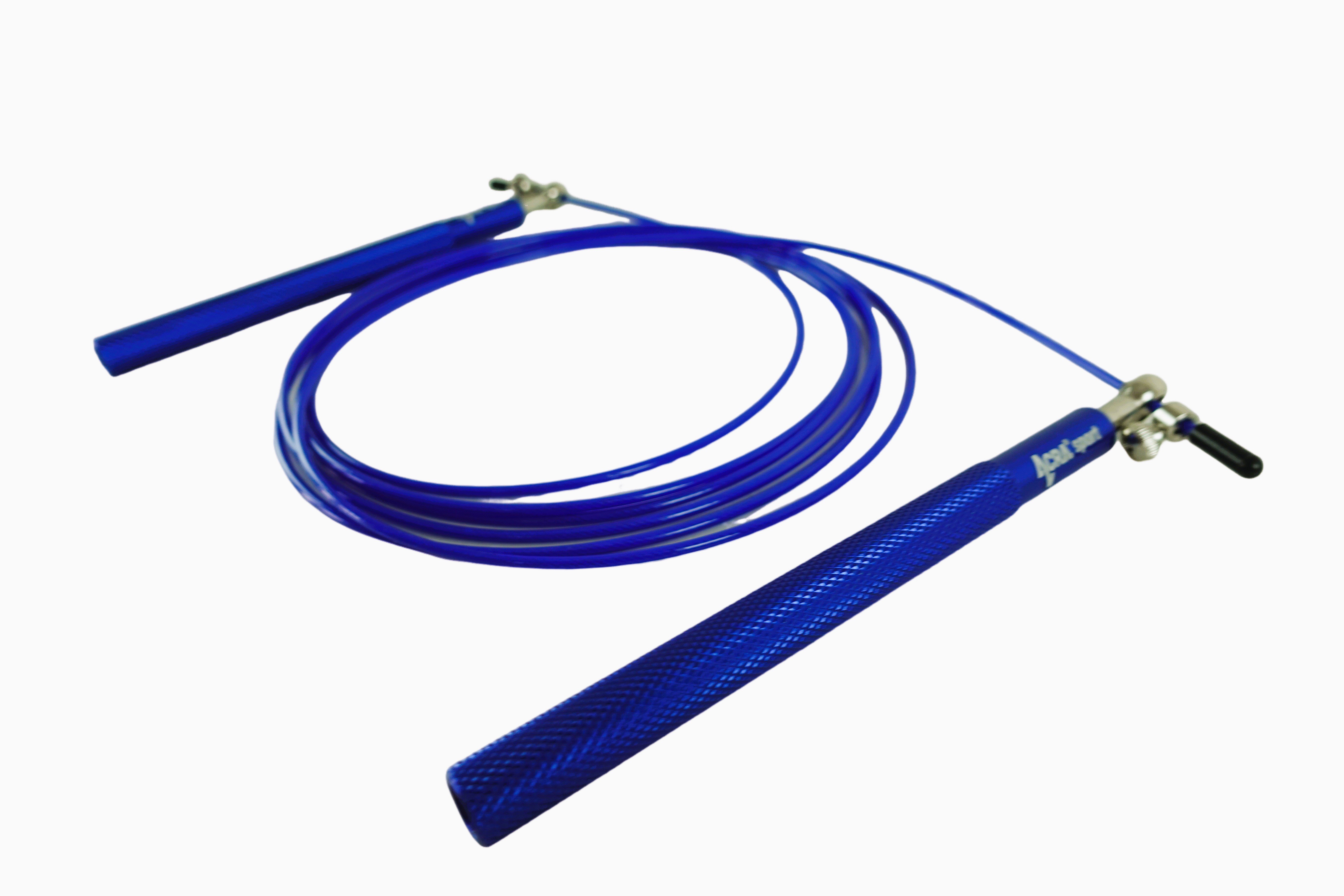 The Acra Blue Skip Jump Rope is an excellent exercise tool for improving overall fitness. The handles, which are made of solid aluminum, have a non-slip surface, ensuring a secure and comfortable fit. The metal swivel bearings with tightening screw allow easy adjustment of the length of the cable as required. The lanyard itself has a steel core protected by a rubber bungee, and is finished with rubber removable sleeves that allow for precise shortening of the jump rope.