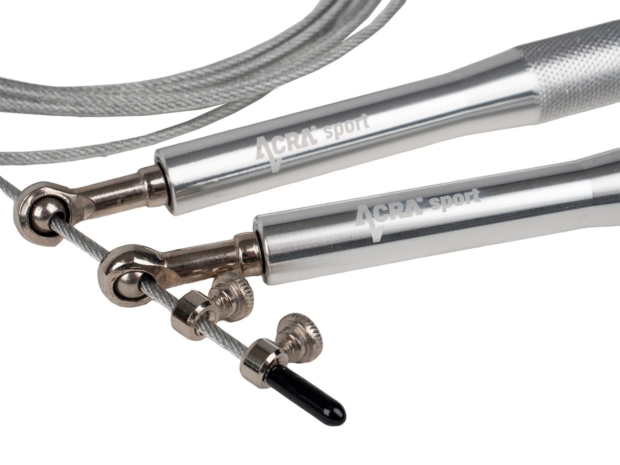 The Acra Silver Jump Rope is an excellent exercise tool for improving overall fitness. The handles, which are made of solid aluminum, have a non-slip surface, ensuring a secure and comfortable fit. The metal swivel bearings with tightening screw allow easy adjustment of the length of the cable as required. The lanyard itself has a steel core protected by a rubber bungee, and is finished with rubber removable sleeves that allow for precise shortening of the jump rope.