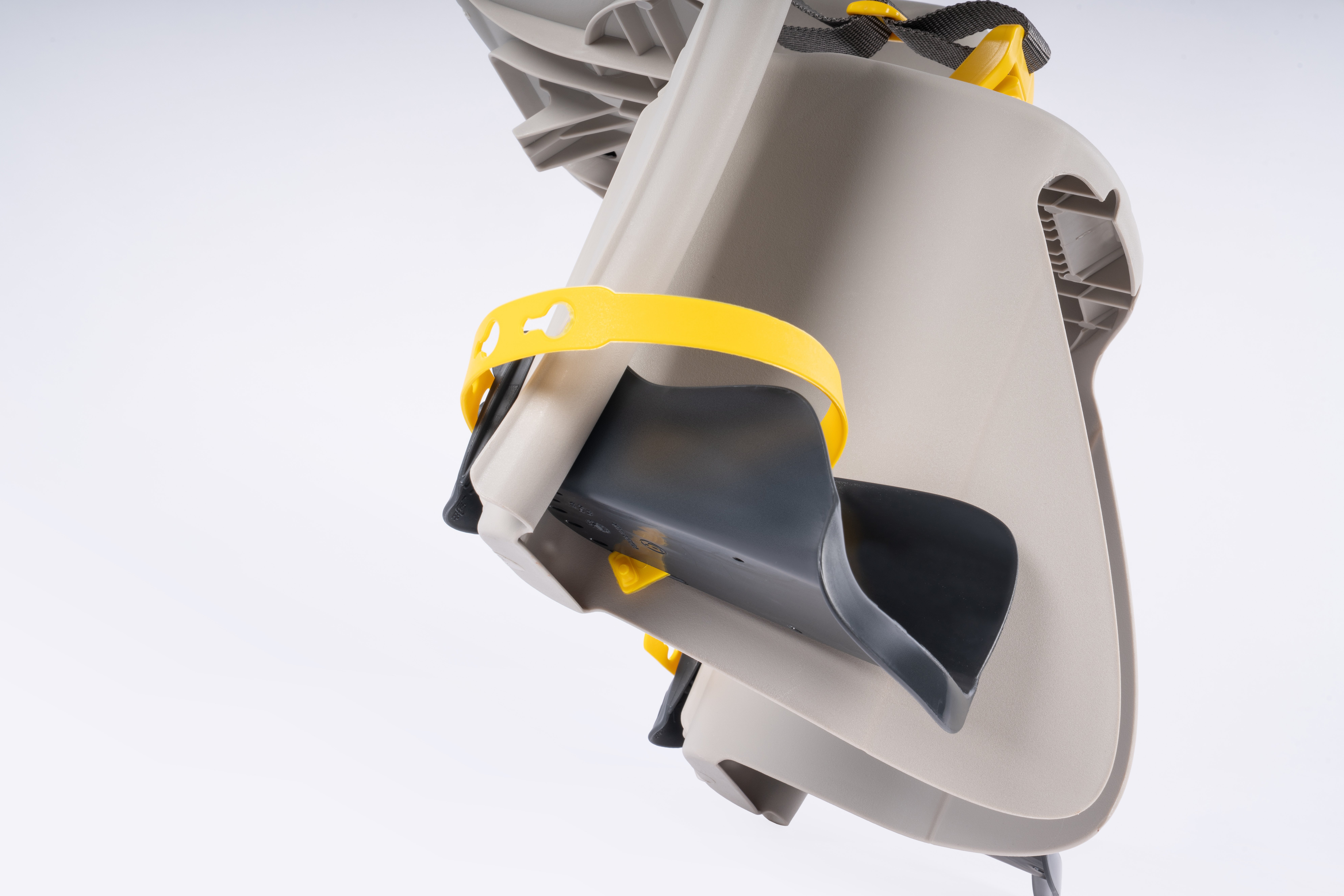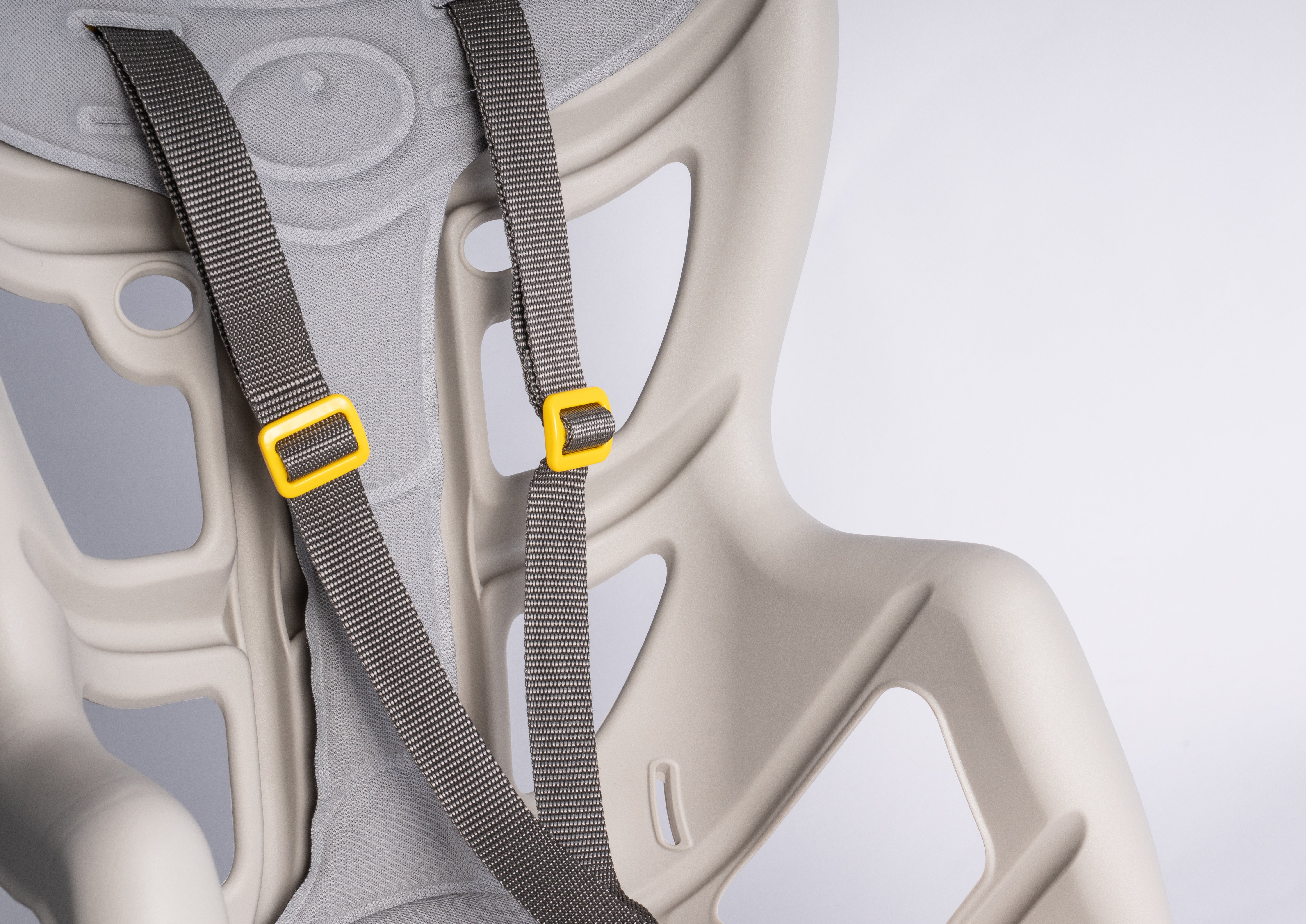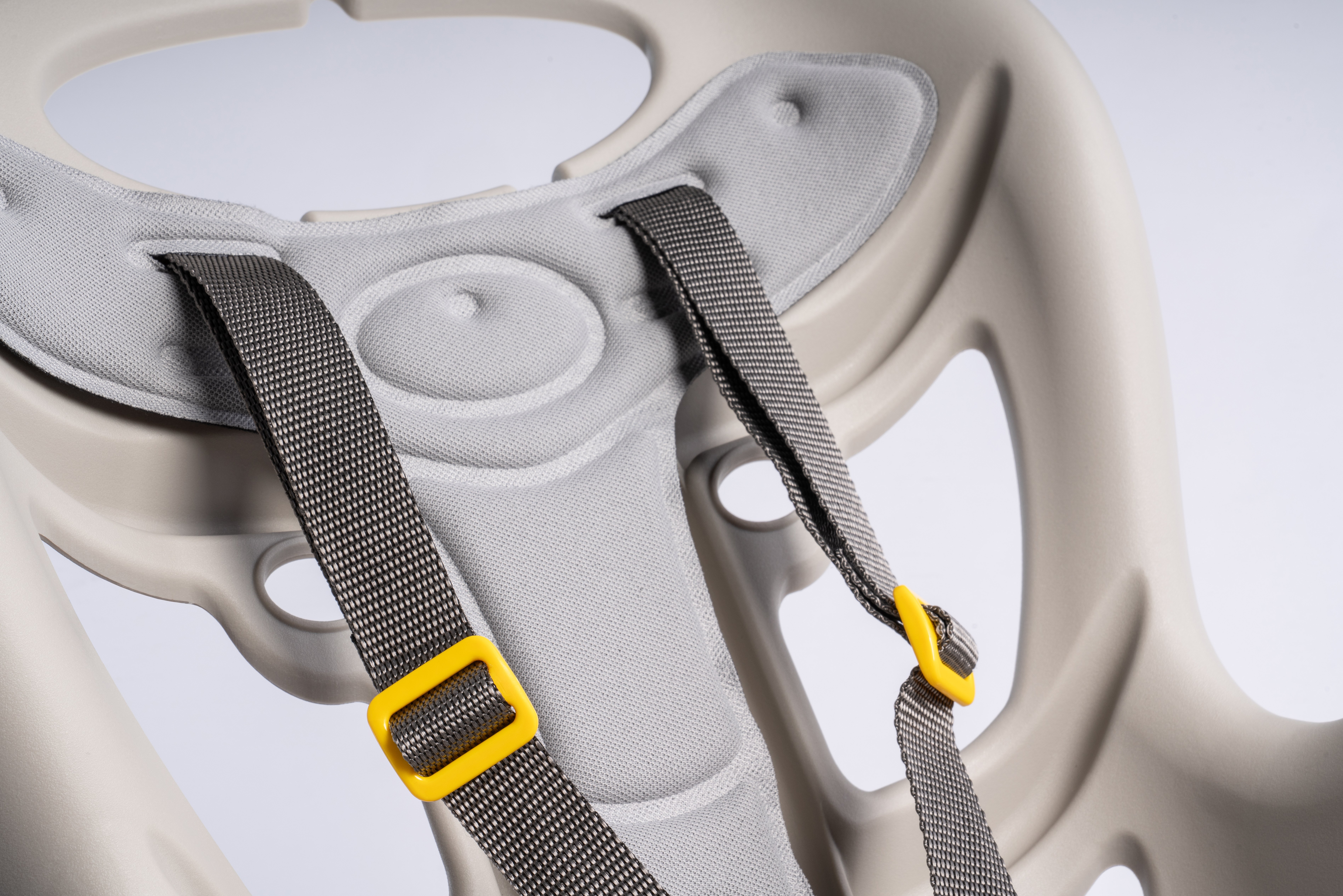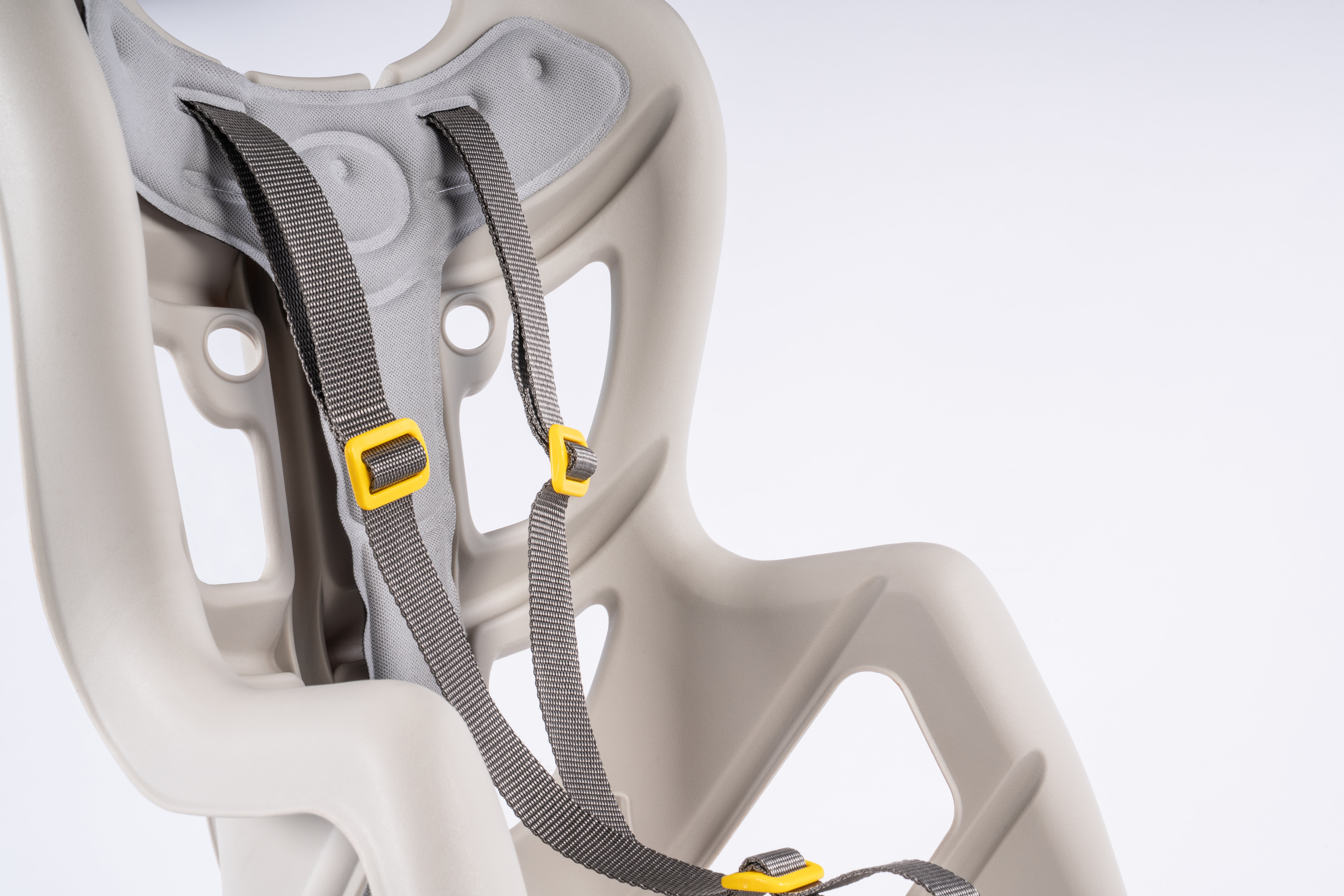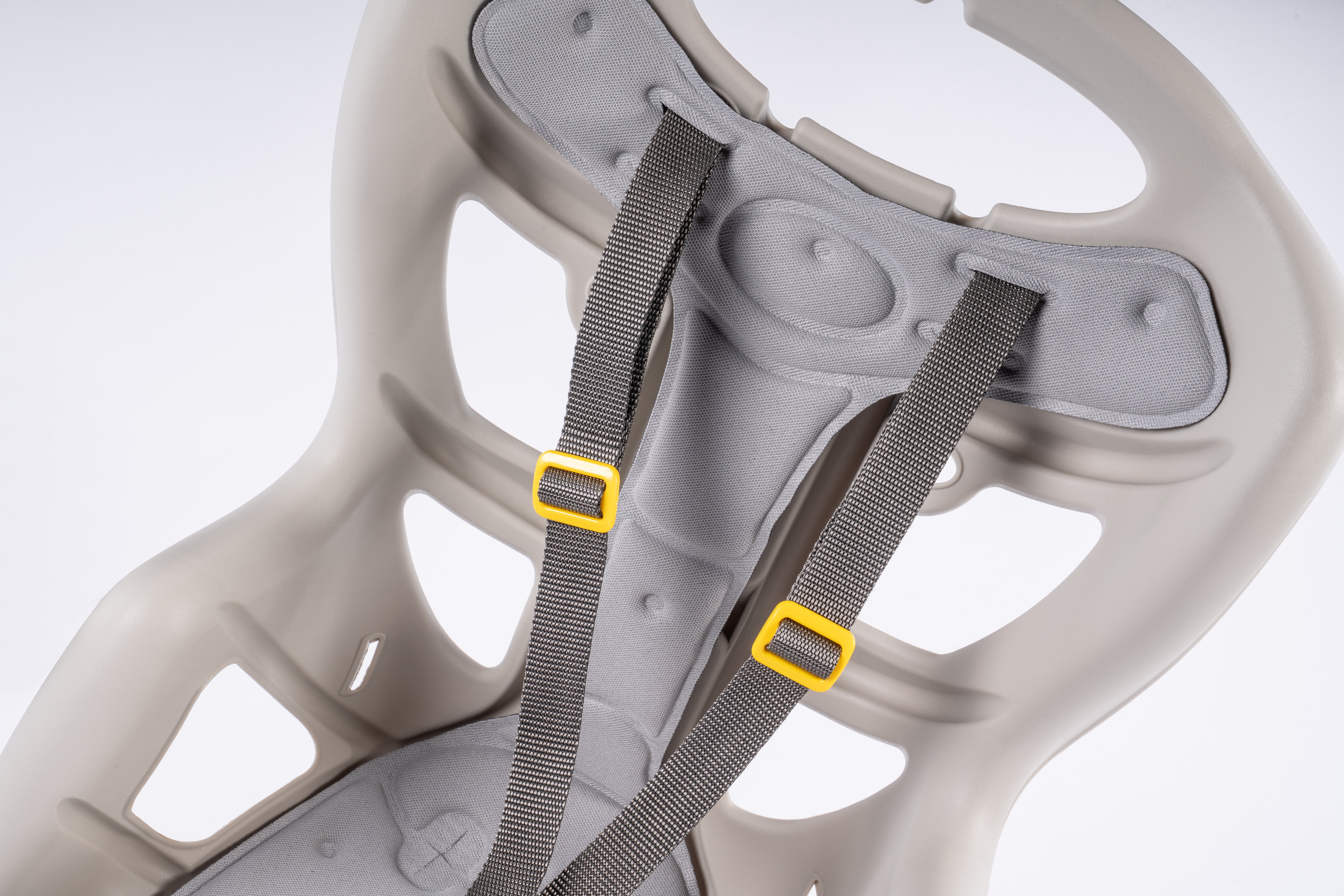 SECURITY SYSTEM: The seat can be attached to the luggage rack on the rear bike rack. The fastening works by a vise which is tightened to the luggage rack by means of a knob. Compatible with 120-175 mm luggage rack length. On electric bikes, compatible with luggage racks up to 185 mm long. The seat has an extremely comfortable safety buckle that attaches and releases with one hand.