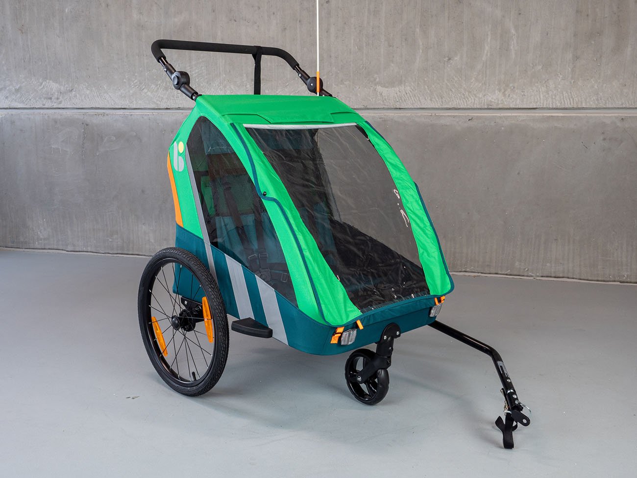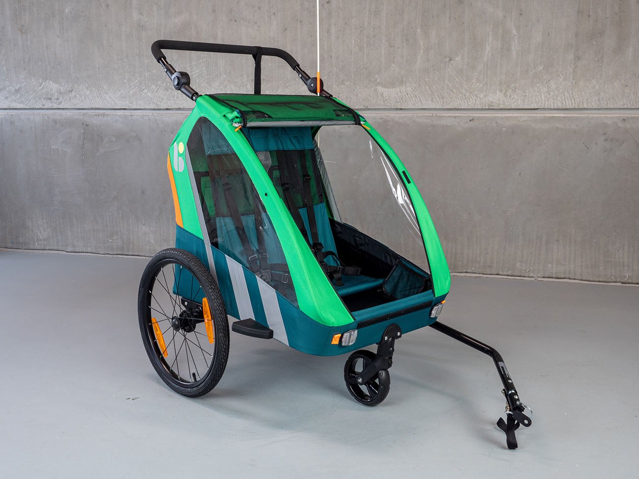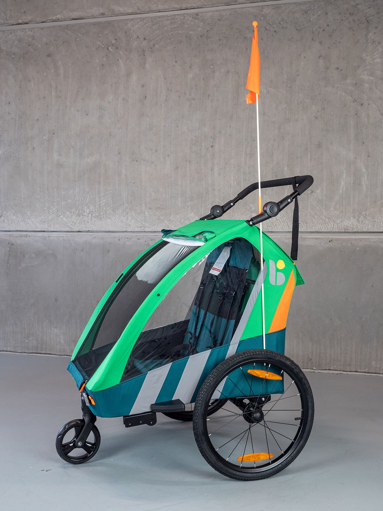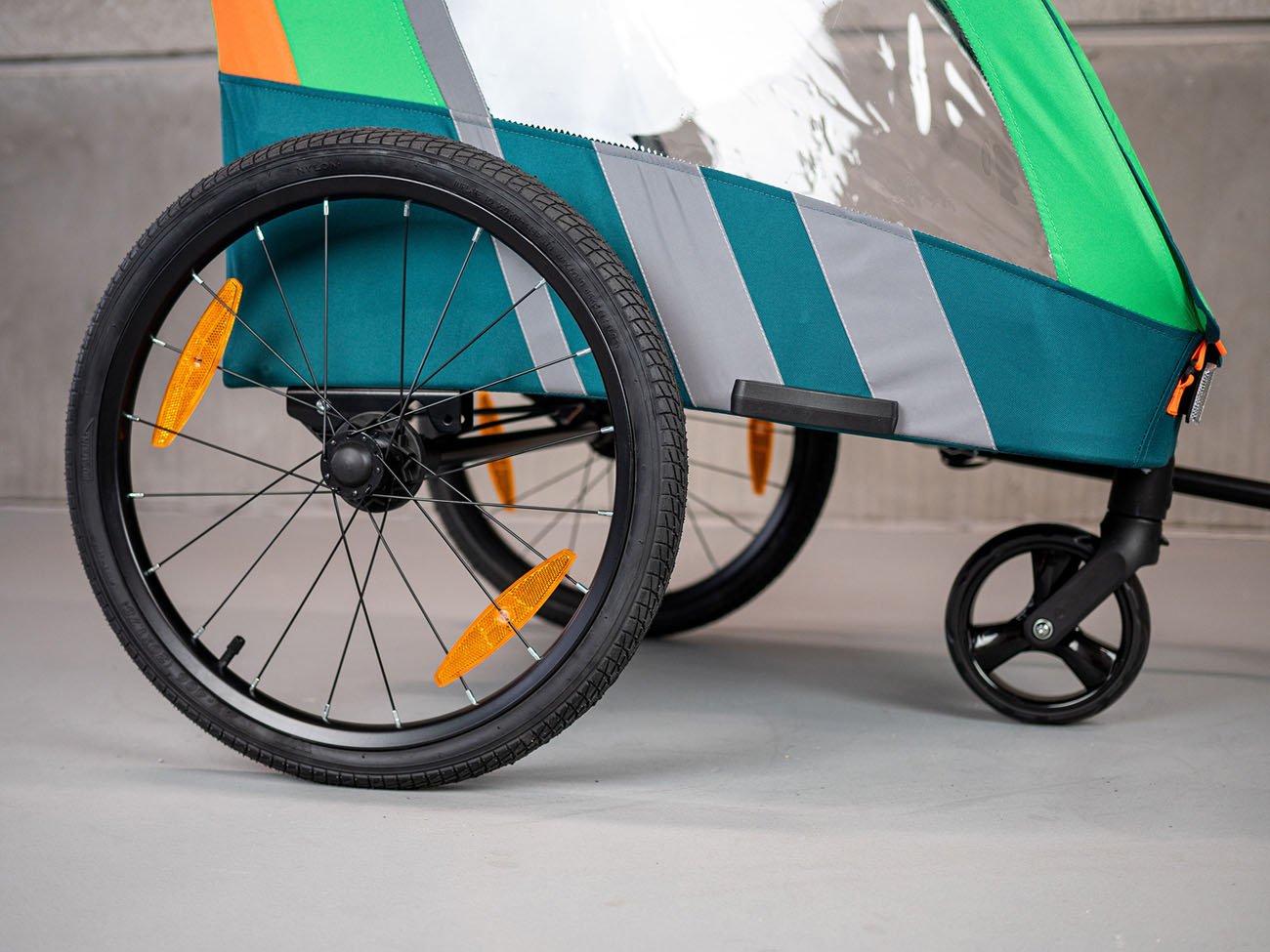 The Trailblazer Child Trailer (2in1) for bicycle combined with a sports stroller for 2 children is a quality model with all certifications for road use. The basis is a two-wheeled trolley with a drawbar, which can be replaced by a third swivel wheel and thus the trolley can be easily and quickly converted into a sports stroller for two children. The trolley is made of waterproof solid material (PES 600D oxford) and is equipped with a transparent PVC window in the front, two smaller windows are also in the side of the trolley (stroller) to give the child (children) a view of the surroundings. The stroller is also equipped with a retractable sun roof and insect screen for use in good weather. The stroller has two seats with 5-point seat belts connected by a single buckle fastened to the child's chest. Access to the trolley is from the front and is very convenient for storing children. The stroller has adjustable suspension stiffness, is equipped with safety parking brake with easy operation. The trolley is also equipped with reflective stripes on the sides, reflectors on the front and rear as well as a 150 cm high orange warning flag. The trolley is equipped with two stable 20" wheels (+ one swivel additional wheel stored in a special pocket on the trolley). Furthermore, the trolley has a large bed space in the rear. The sturdy and lightweight construction with the easy possibility of converting the trolley into a stroller makes the trolley an attractive means of enabling sporty parents to move outdoors, even with small children. The trolley clamps onto the rear wheel axle. As a safety device to prevent the trolley from detaching, a strap with a carabiner is included, which clamps onto the wheel frame and serves to secure the trolley against detachment even if the clamping nut is loosened.