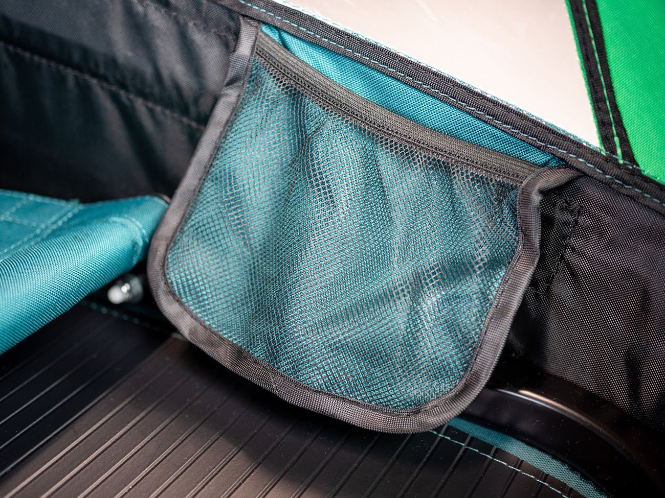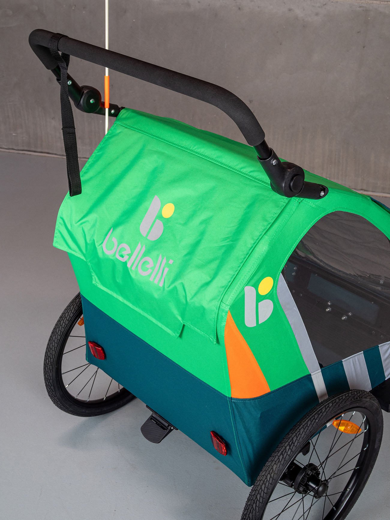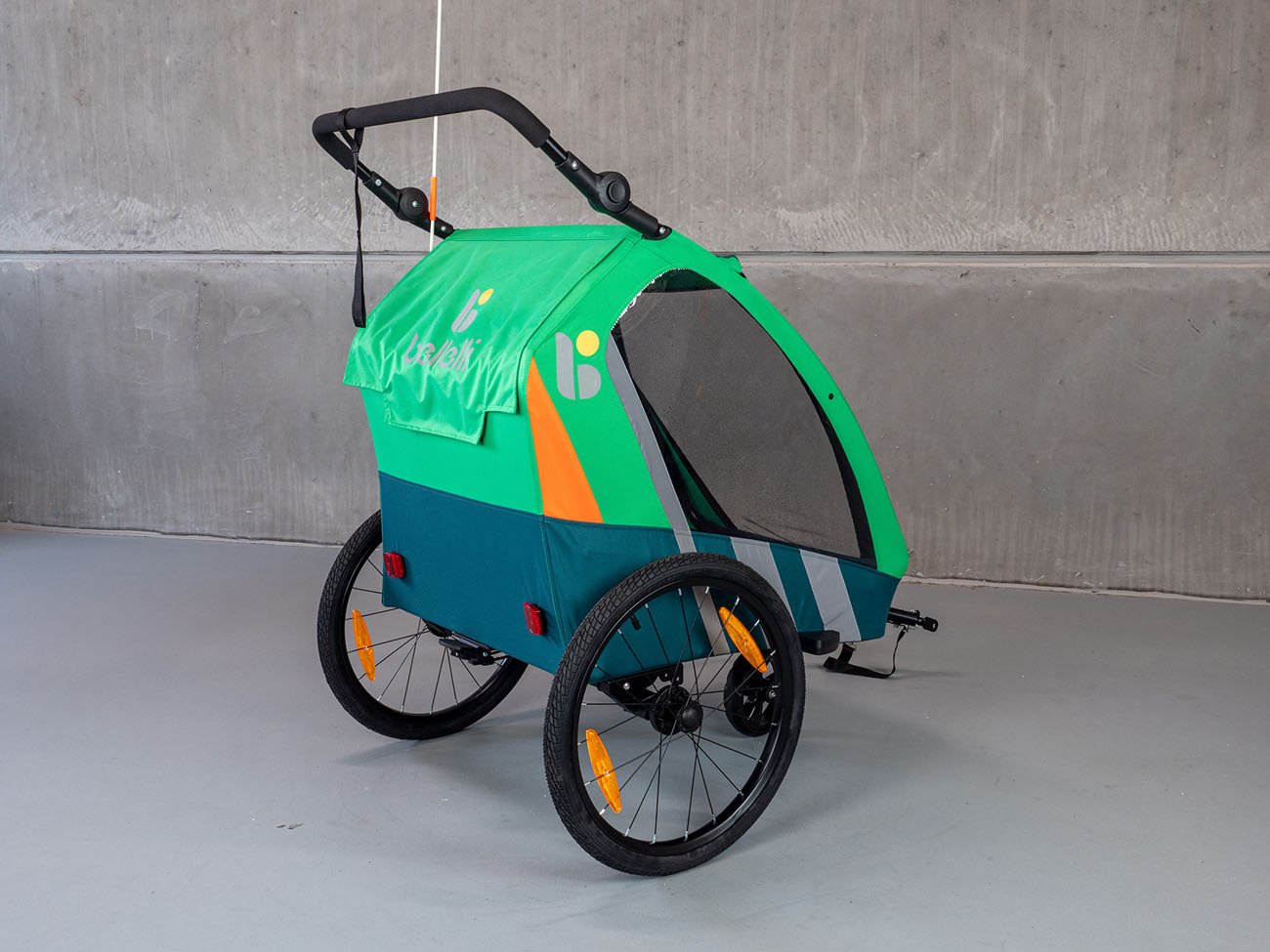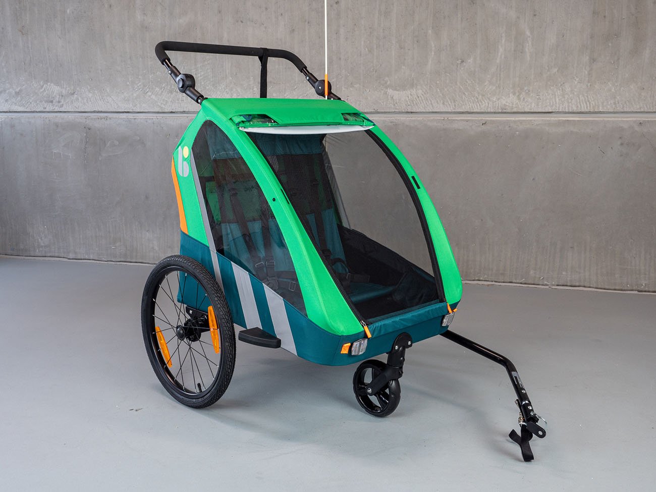 The Trailblazer Child Trailer (2in1) for bicycle combined with a sports stroller for 2 children is a quality model with all certifications for road use. The basis is a two-wheeled trolley with a drawbar, which can be replaced by a third swivel wheel and thus the trolley can be easily and quickly converted into a sports stroller for two children. The trolley is made of waterproof solid material (PES 600D oxford) and is equipped with a transparent PVC window in the front, two smaller windows are also in the side of the trolley (stroller) to give the child (children) a view of the surroundings. The stroller is also equipped with a retractable sun roof and insect screen for use in good weather. The stroller has two seats with 5-point seat belts connected by a single buckle fastened to the child's chest. Access to the trolley is from the front and is very convenient for storing children. The stroller has adjustable suspension stiffness, is equipped with safety parking brake with easy operation. The trolley is also equipped with reflective stripes on the sides, reflectors on the front and rear as well as a 150 cm high orange warning flag. The trolley is equipped with two stable 20" wheels (+ one swivel additional wheel stored in a special pocket on the trolley). Furthermore, the trolley has a large bed space in the rear. The sturdy and lightweight construction with the easy possibility of converting the trolley into a stroller makes the trolley an attractive means of enabling sporty parents to move outdoors, even with small children. The trolley clamps onto the rear wheel axle. As a safety device to prevent the trolley from detaching, a strap with a carabiner is included, which clamps onto the wheel frame and serves to secure the trolley against detachment even if the clamping nut is loosened.