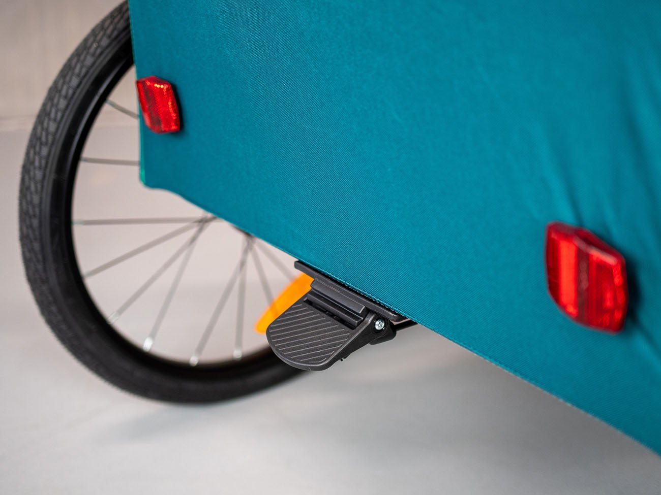 easy attachment to the rear wheel axle, secured by a clamping strap with carabiner to prevent the trolley from detaching while driving