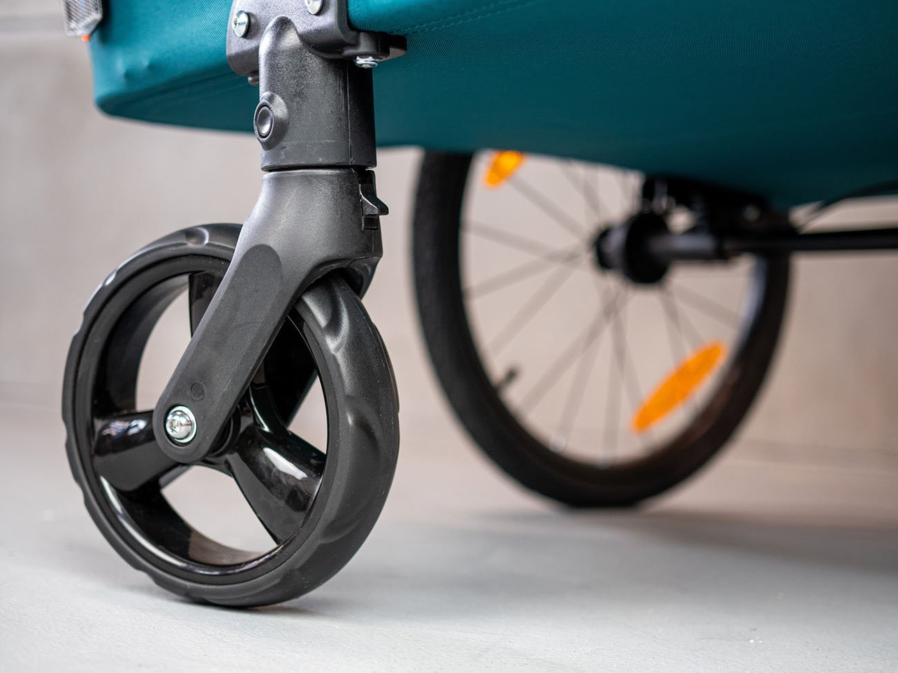 20" wheels - two fixed, third swivel to convert the trolley into a stroller (at the same time, the tow bar easily slides into the frame of the trolley,