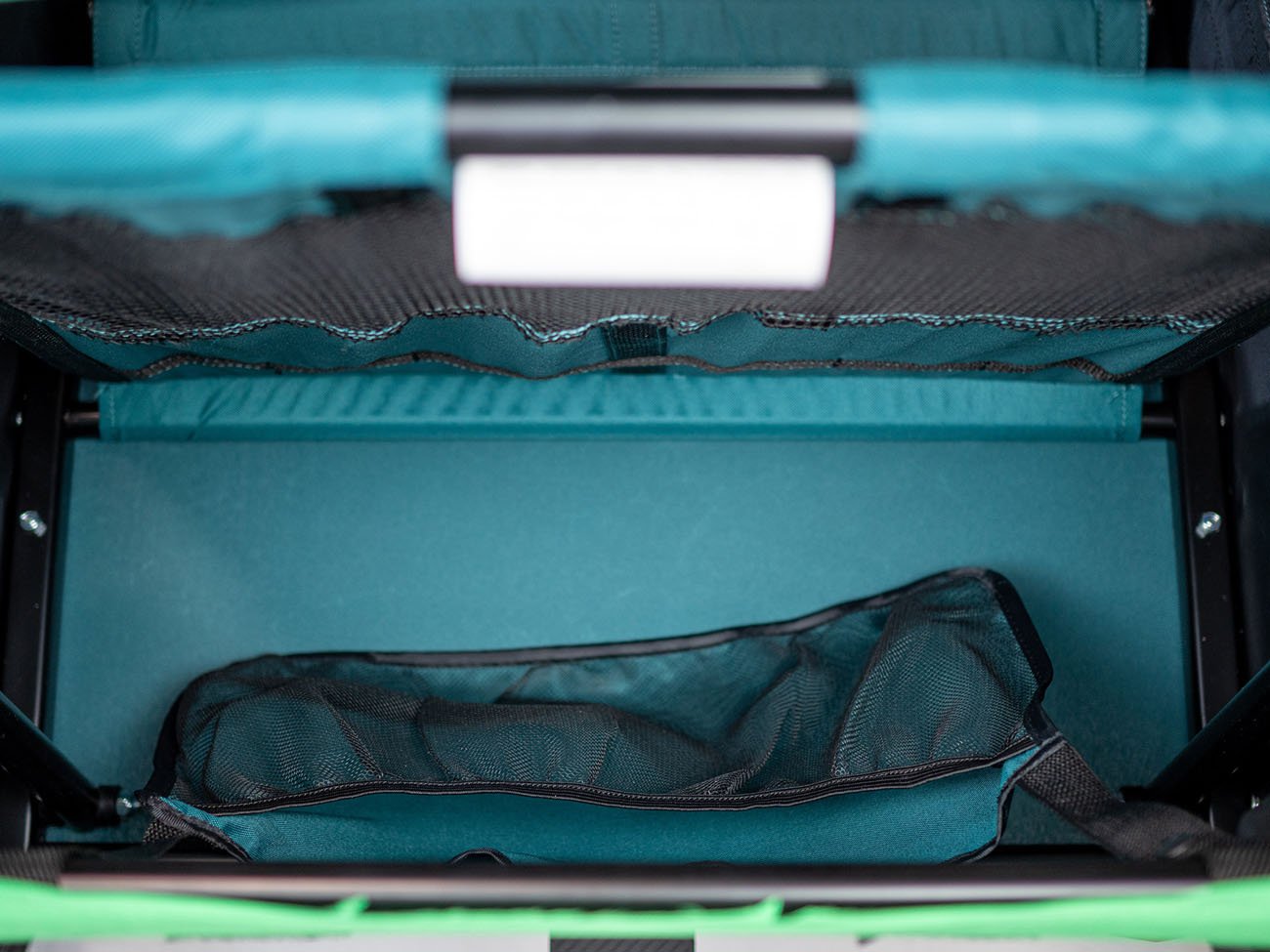 The advantage of the trolley (stroller) is the possibility of use for one or two children. The recommended weight limit is 16 kg per child, the height limit is up to approx. 110 cm height of the children. The minimum recommended age is 9 months or the child's ability to sit independently.