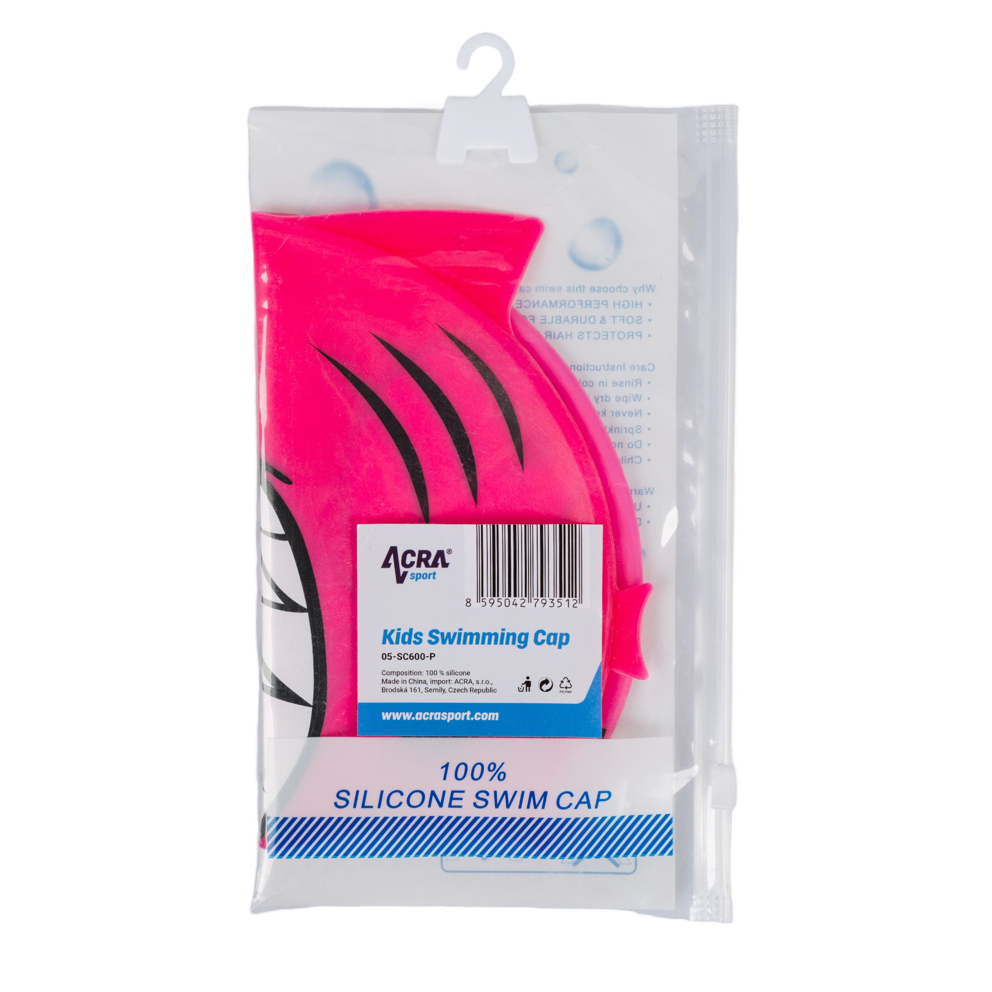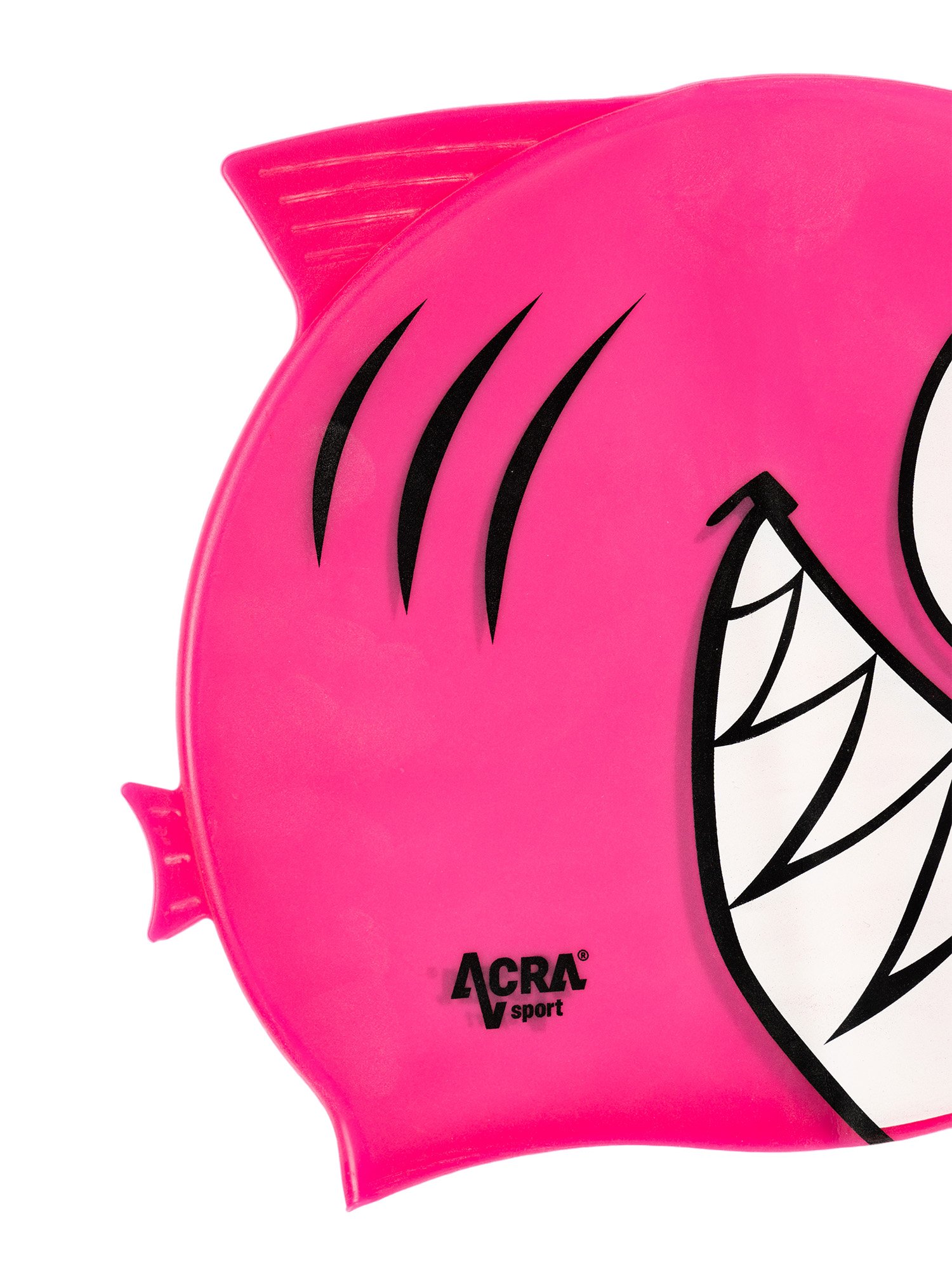 PIRANHA Motif: Thanks to the cute piranha motif, kids will instantly love it and swimming will be even more fun.100% Silicone: Made of high quality silicone that is soft, flexible and comfortable to the touch. It doesn't irritate skin or hair.High elasticity:The cap is easy to put on and take off, adjusts to different head sizes and doesn't pull hair.Hair protection:It reliably protects hair from chlorine and getting wet, which you and your kids will appreciate.Long life:Silicone is a very durable material that guarantees a long life of the cap even with frequent use.Bright pink color: The beautiful pink color is attractive to children and also increases their visibility in the water.With the PIRANHA swimming cap, every visit to the pool or swimming at the sea will be full of joy and well-being!