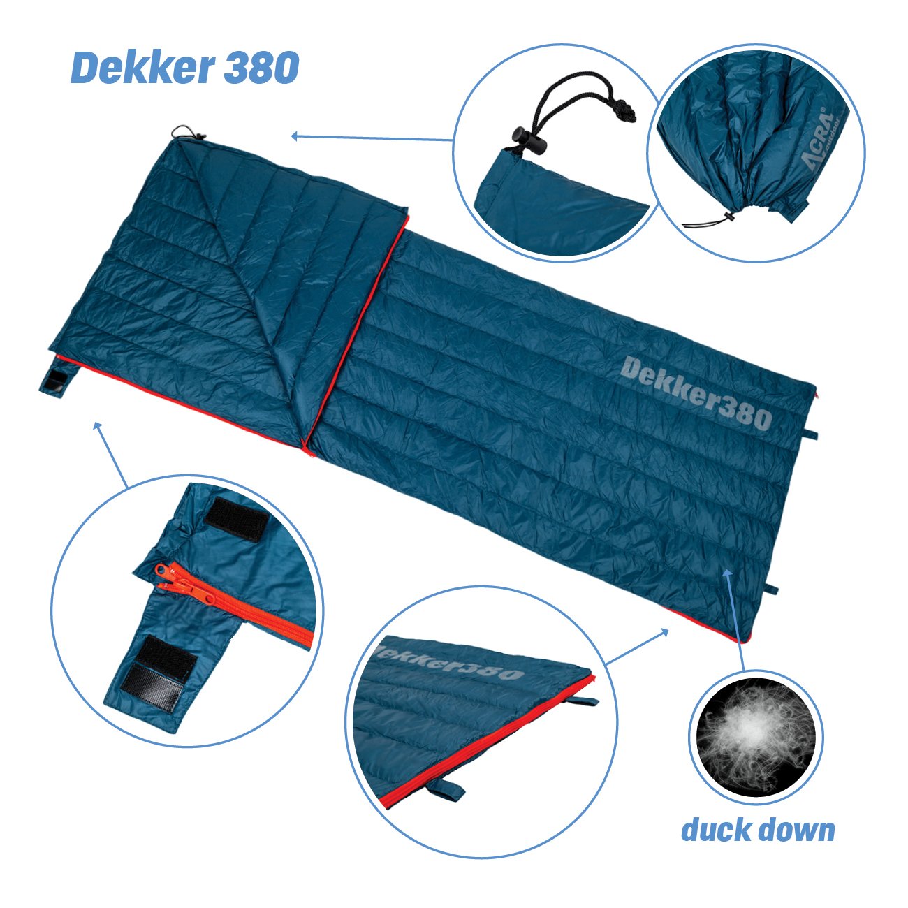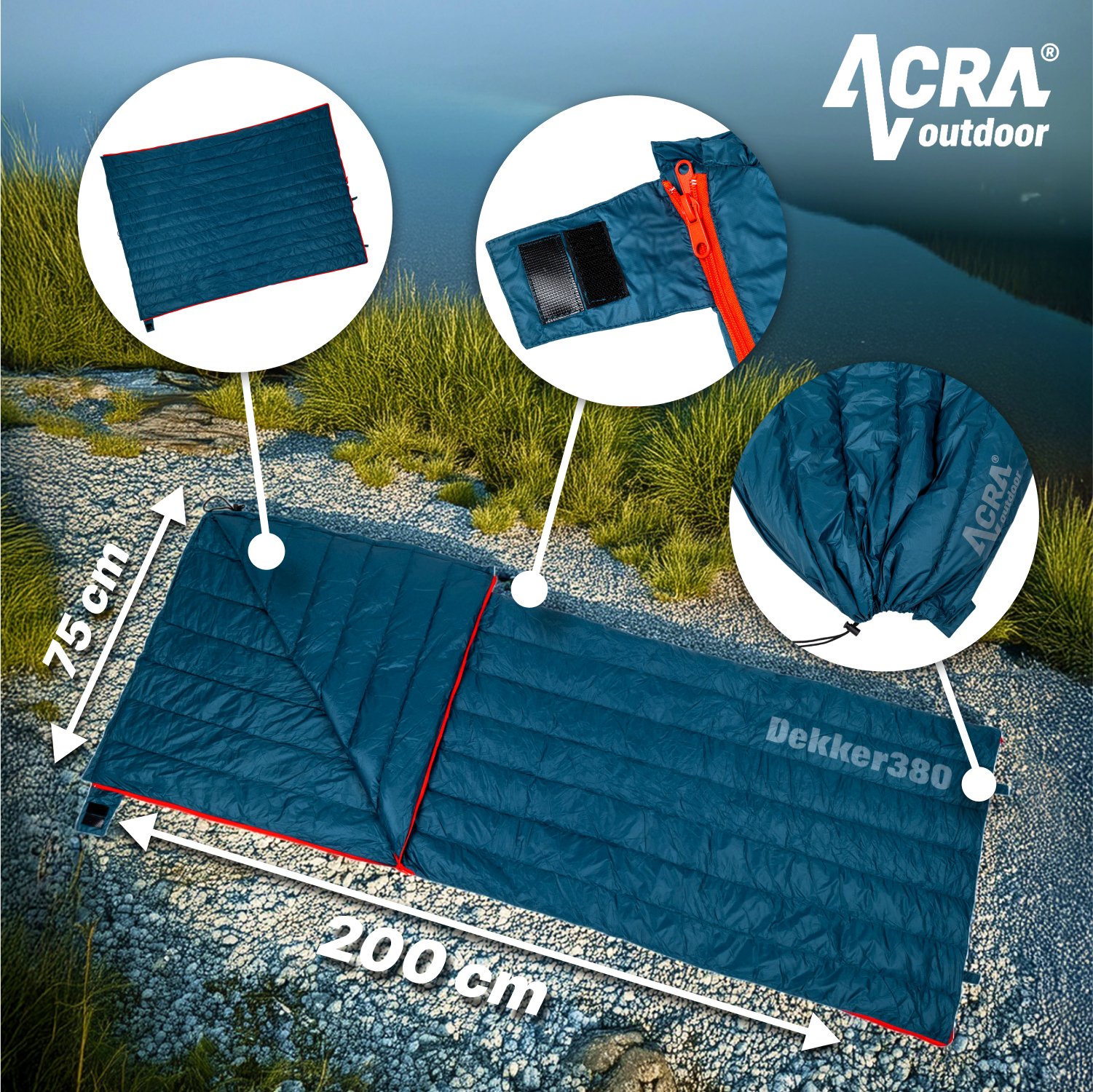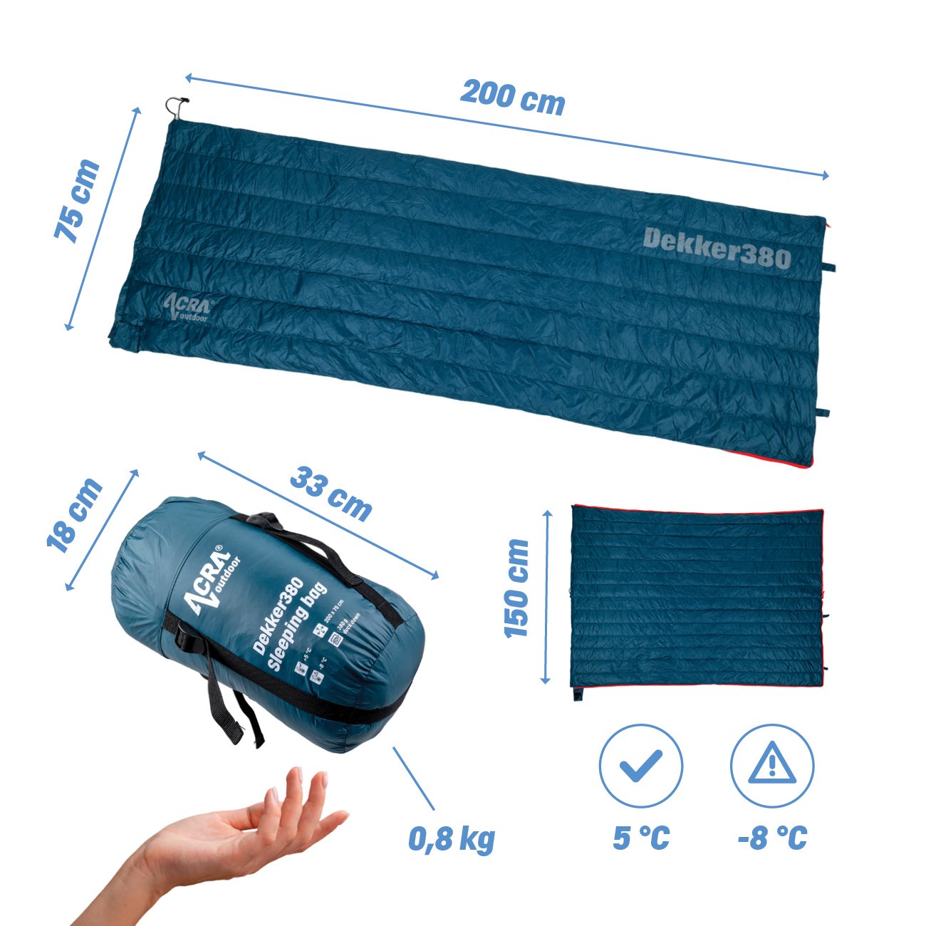 Classic sleeping bag mode: Surround yourself with the warm comfort of 380 grams of premium white duck down. With generous dimensions of 200 cm in length and 75 cm in width, you can comfortably stretch out and enjoy sleep without restrictions. Ideal for nights under a tent, in a mountain cabin or anywhere you need reliable warmth.Luxury Blanket Mode: One zip turns the sleeping bag into a spacious blanket measuring 200 cm in length and an amazing 150 cm in width! Two people can fit comfortably underneath, making it ideal for romantic moments under the stars, cosy evenings in the caravan or motorhome, or simply as an extra blanket for cooler mornings at the campsite. You can save the space that a traditional duvet would take up!Fill with feathers for unbeatable comfort and warmth in all weather: With 380 grams of premium duck feathers (Fill: 380), the Dekker380 will keep you cosy and warm.