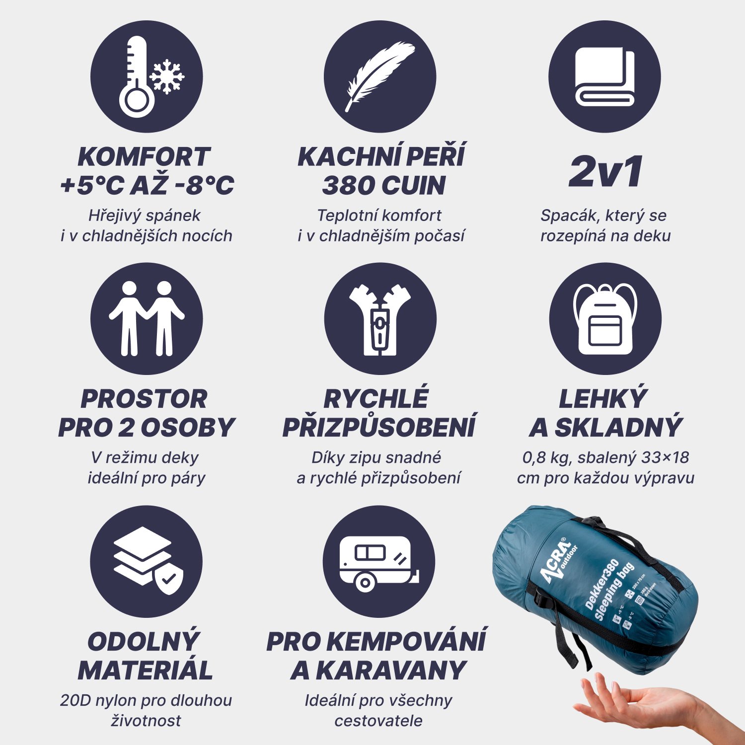 No more compromises between sleeping bag and blanket in the limited space of a tent or caravan! With the ACRA Dekker380 you get an ingenious 2in1 solution that turns every night in the great outdoors into a luxurious experience, whether you're camping, in a motorhome or under the stars. This innovative down sleeping bag is designed for maximum flexibility and comfort.