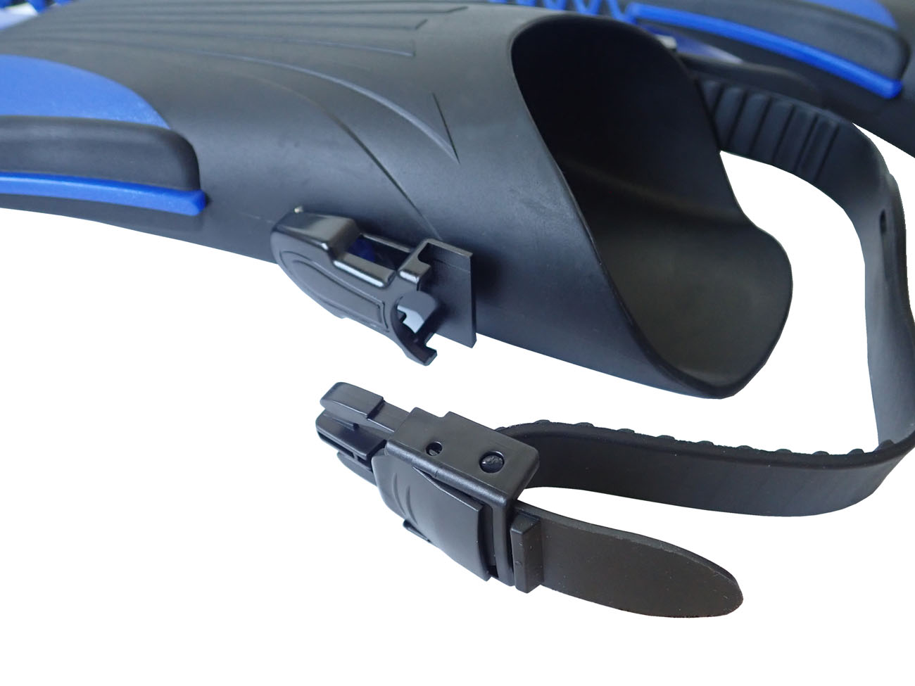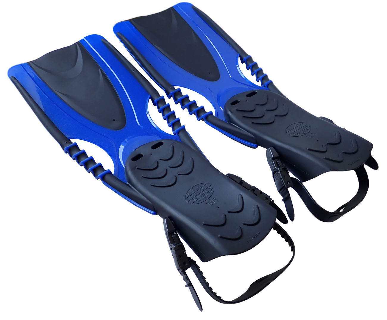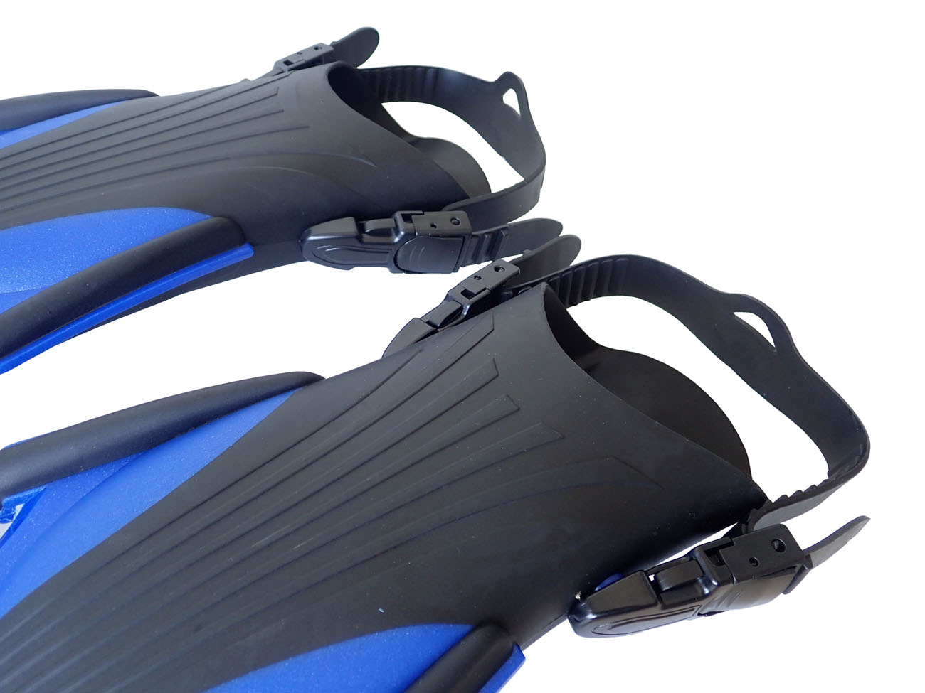 DELTA expandable fins with clamping adjustable belt in size range 36 - 40 (22,5 - 25,5 cm). Packed in PE bag. Available in blue.