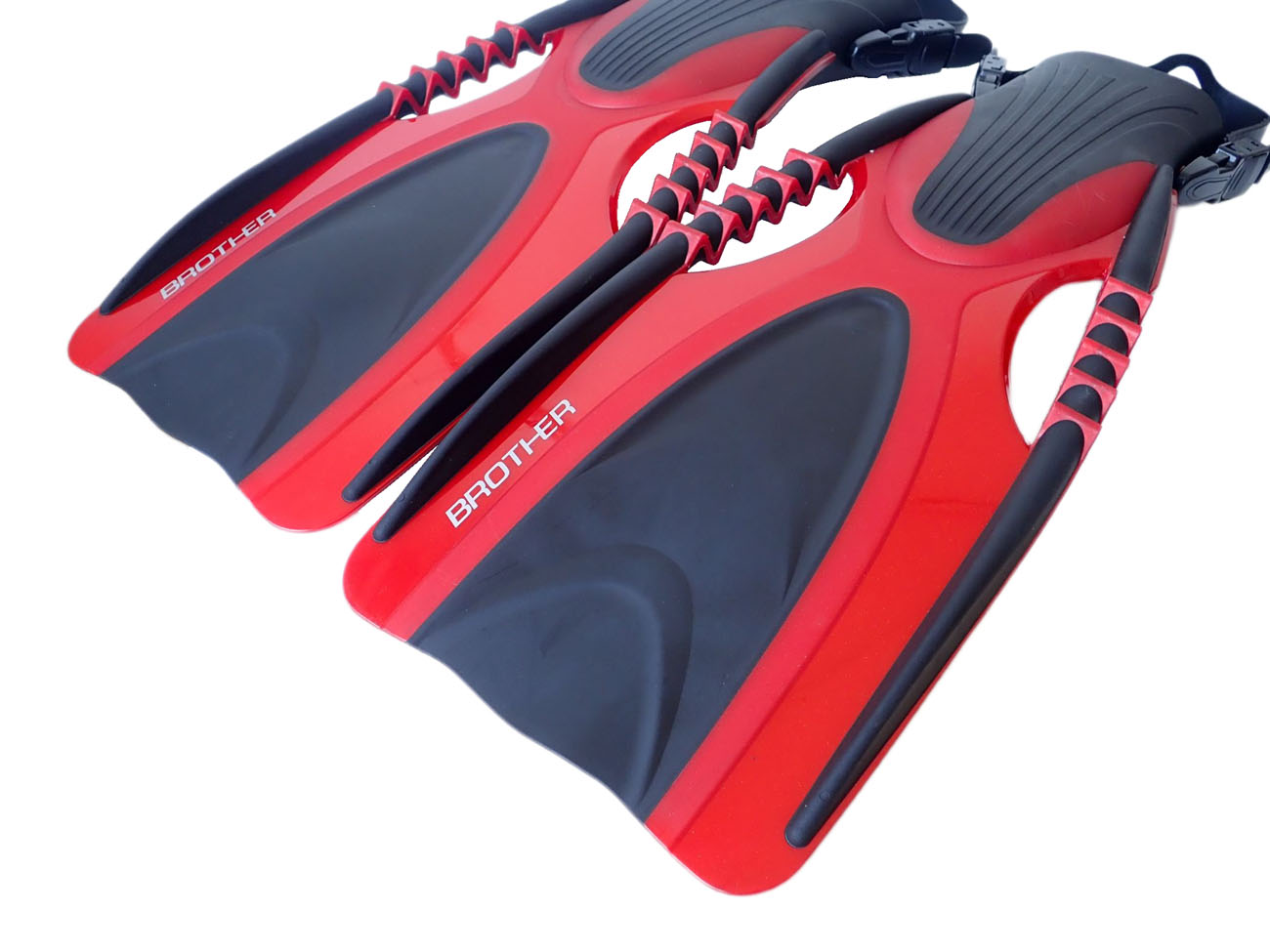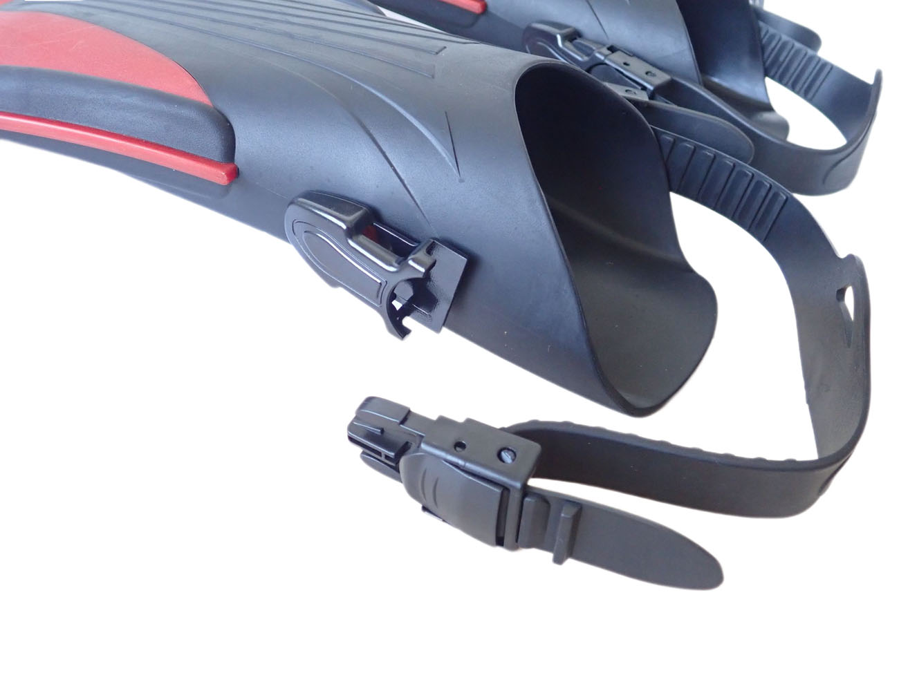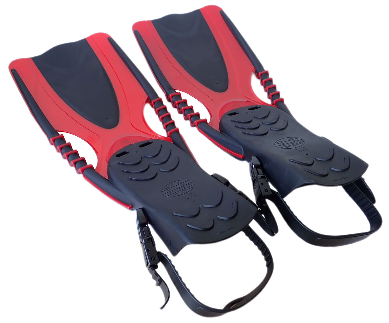DELTA expandable fins with clamping adjustable belt in size range 40 - 43 (25,5 - 28 cm). Packed in PE bag. Available in red.