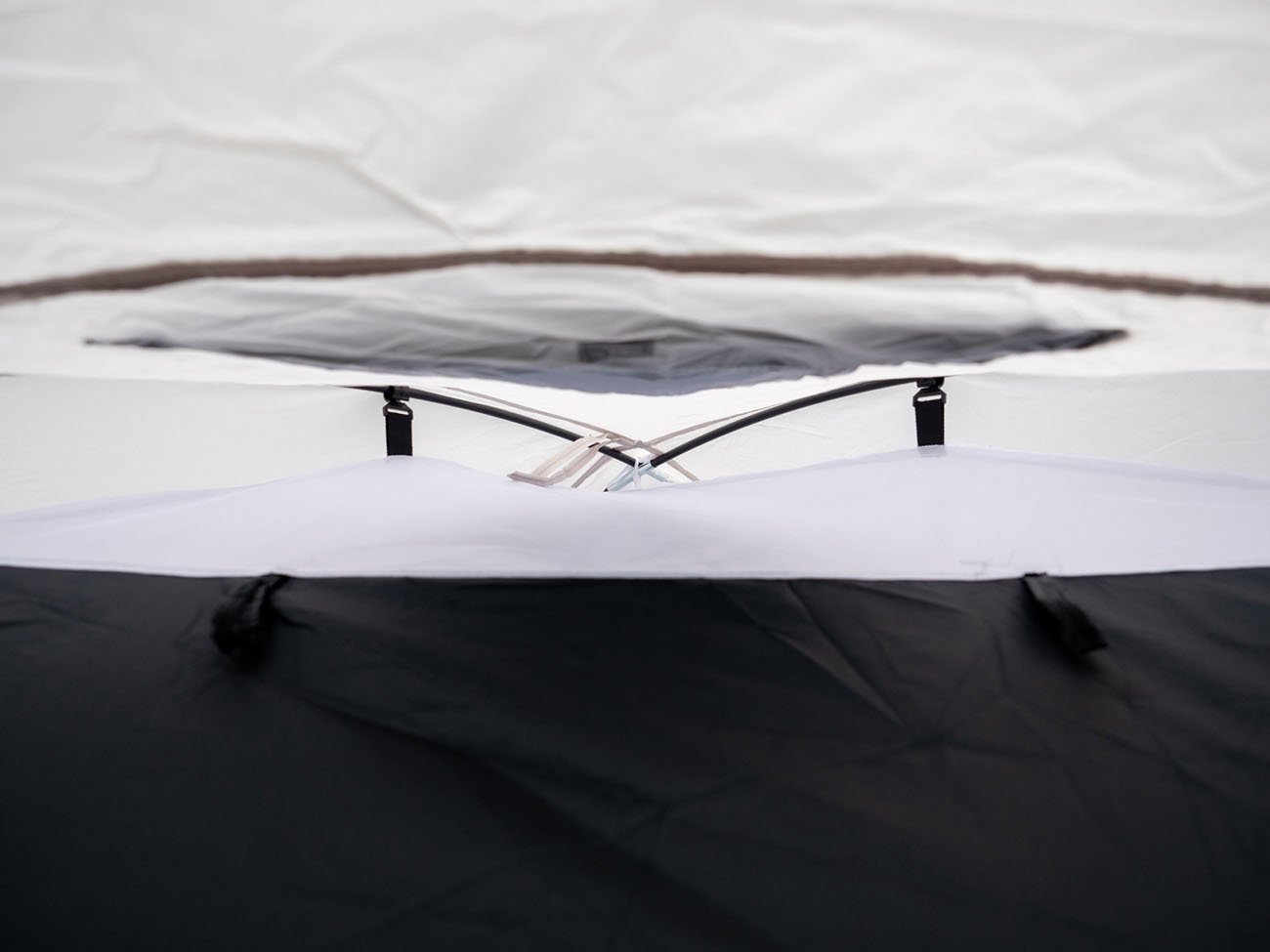 tent has a hinged bedroom and top shell stretched over laminate support poles, tent also has 2 metal folding poles for attaching the canopy over the entrance