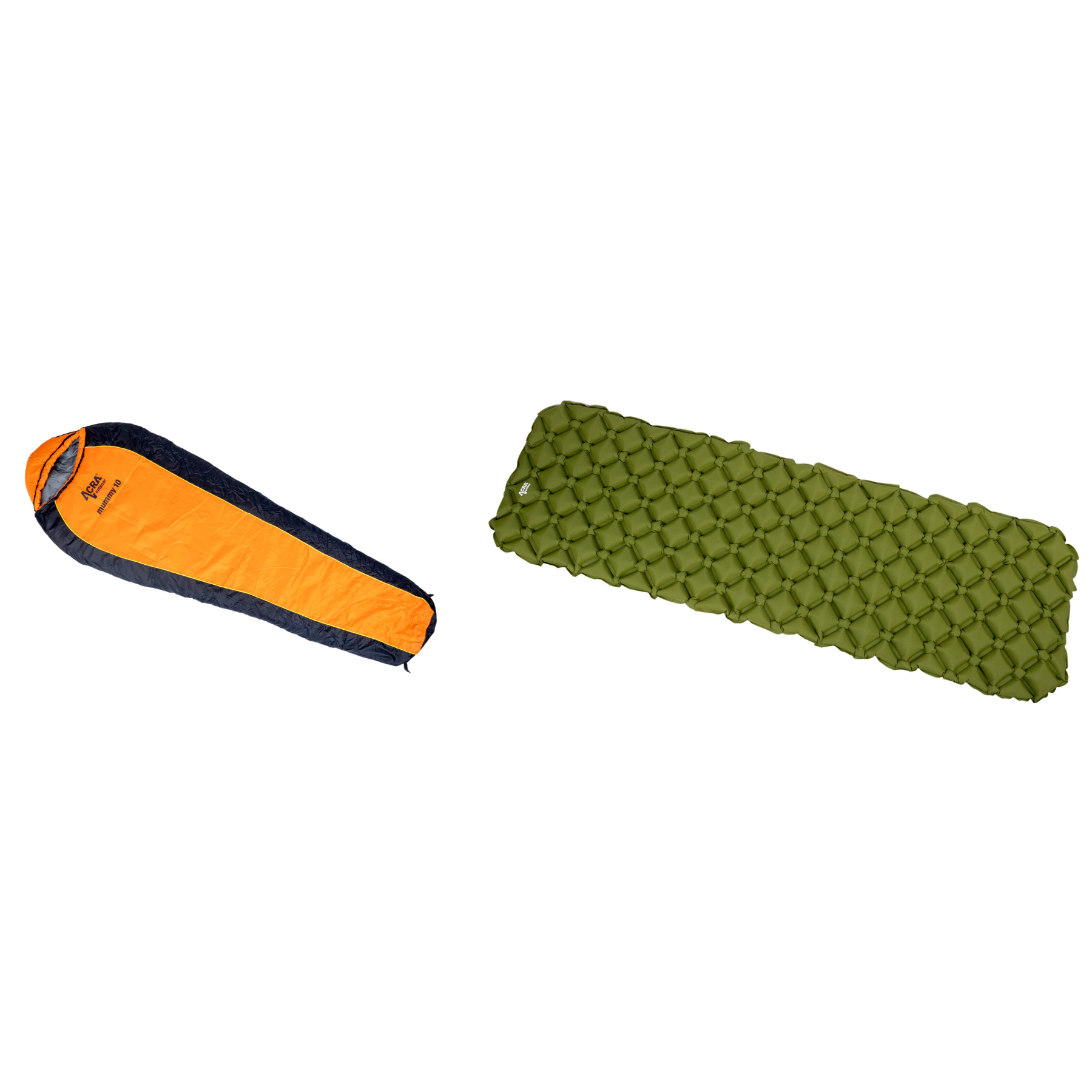 Package includes Acra Mummy 10 Sleeping Bag and L140ZEL Inflatable Carrycot - Green.