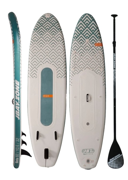 Included: - Pump: 2.0bar/ 29psi (double acting pump) Bravo (Hand Pump) Bravo® 2x2000cc special for SUP, ideal for high pressure valves with bayonet coupling. Single-Action Double-Action mode option)- Carrying bag: included (JBAY.ZONE Premium carrying bag is ideal for carrying the paddleboard and its accessories)- Fins: Detachable fins- Repair kit: Included (Handy repair kit with laminated PVC patch (does not contain glue) for minor repairs to punctures or damage to the outer layer of material)- Paddle: Expandable aluminum shaft 165-215 cm (Adjustable aluminum paddle JBAY.ZONE with one polypropylene blade. The modular aluminium handle can be extended by 50 cm)- Lightweight and extremely strong safety "leash" JBAY.ZONE. Maximum length when extended 300 cm.