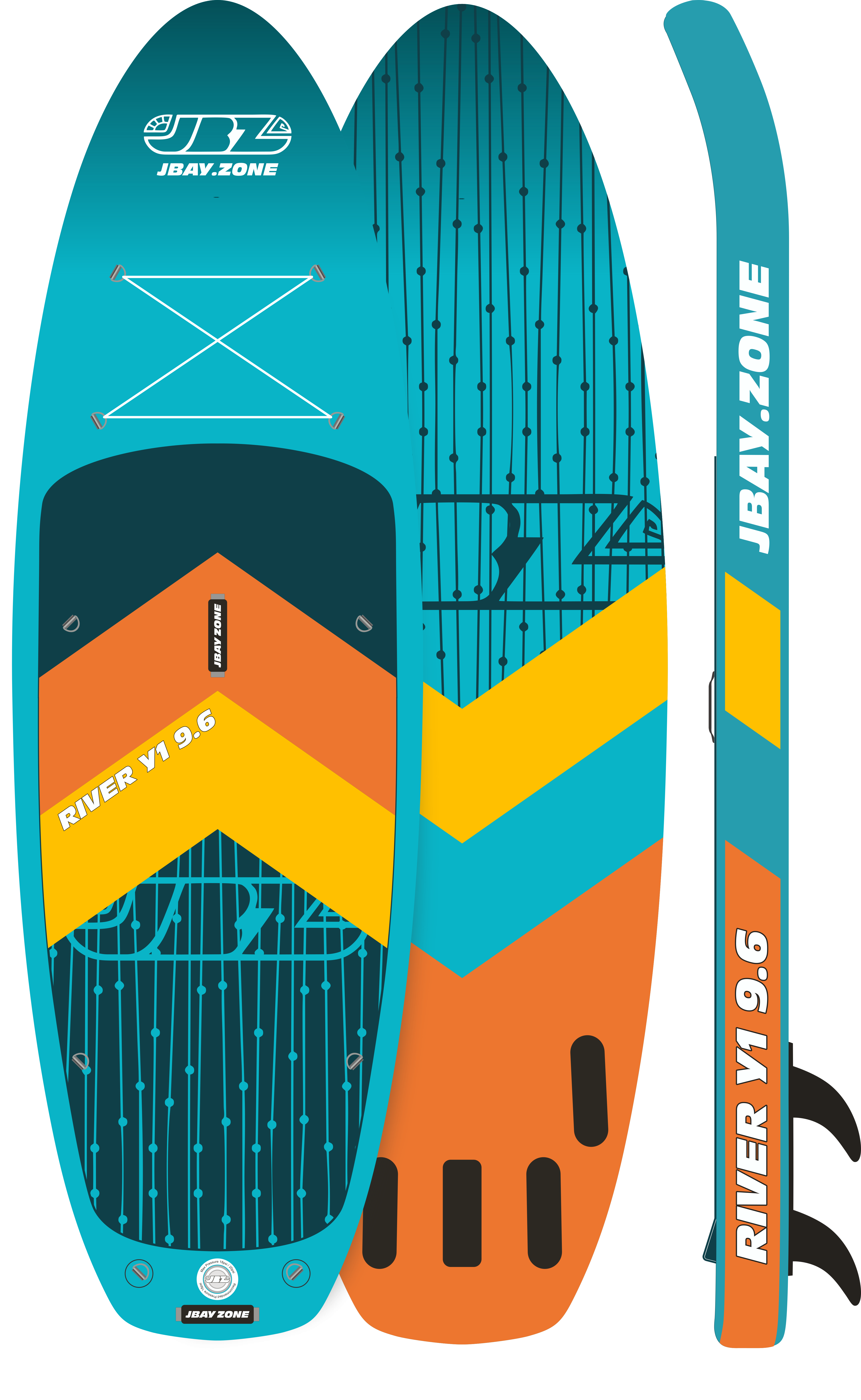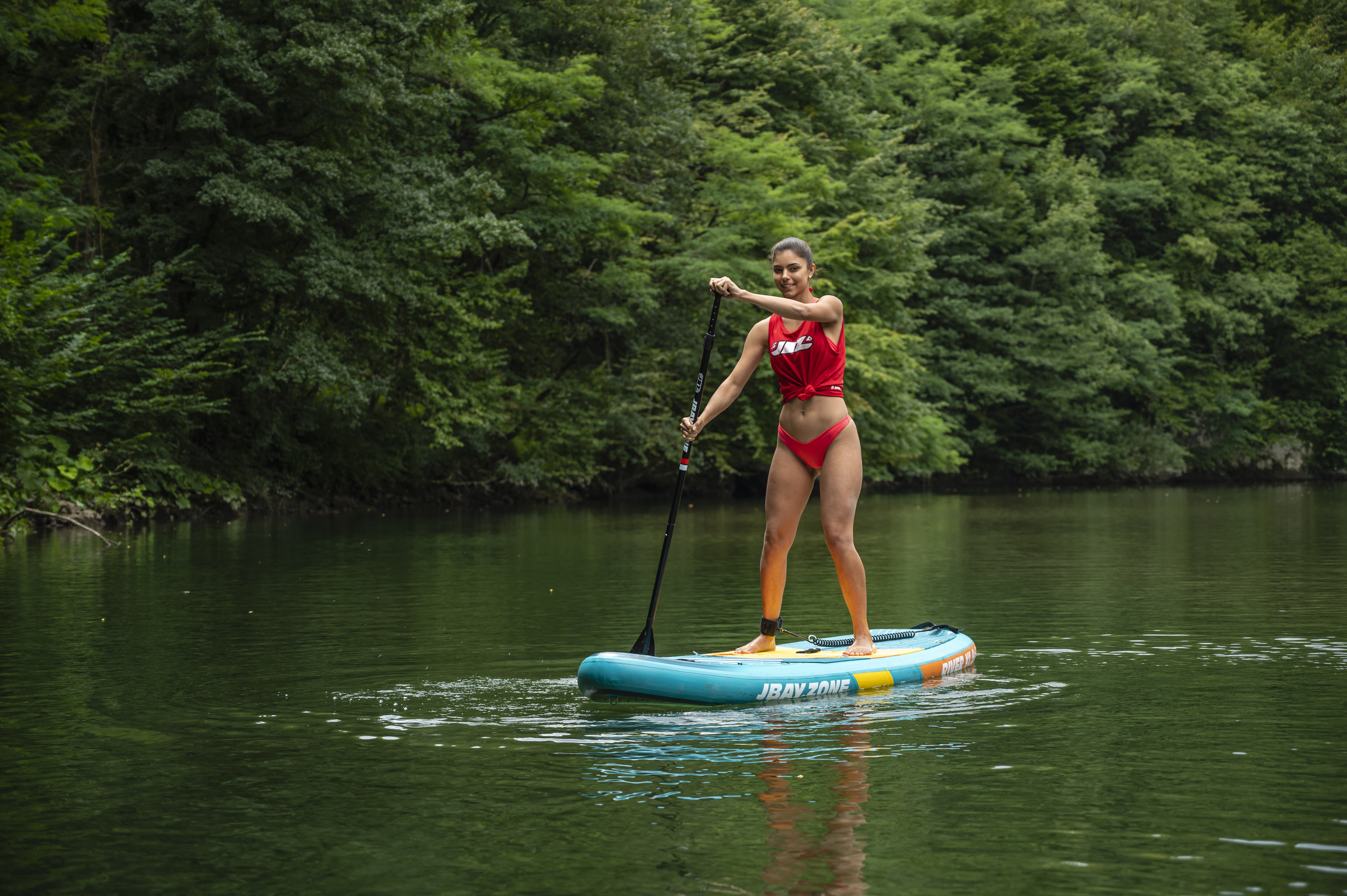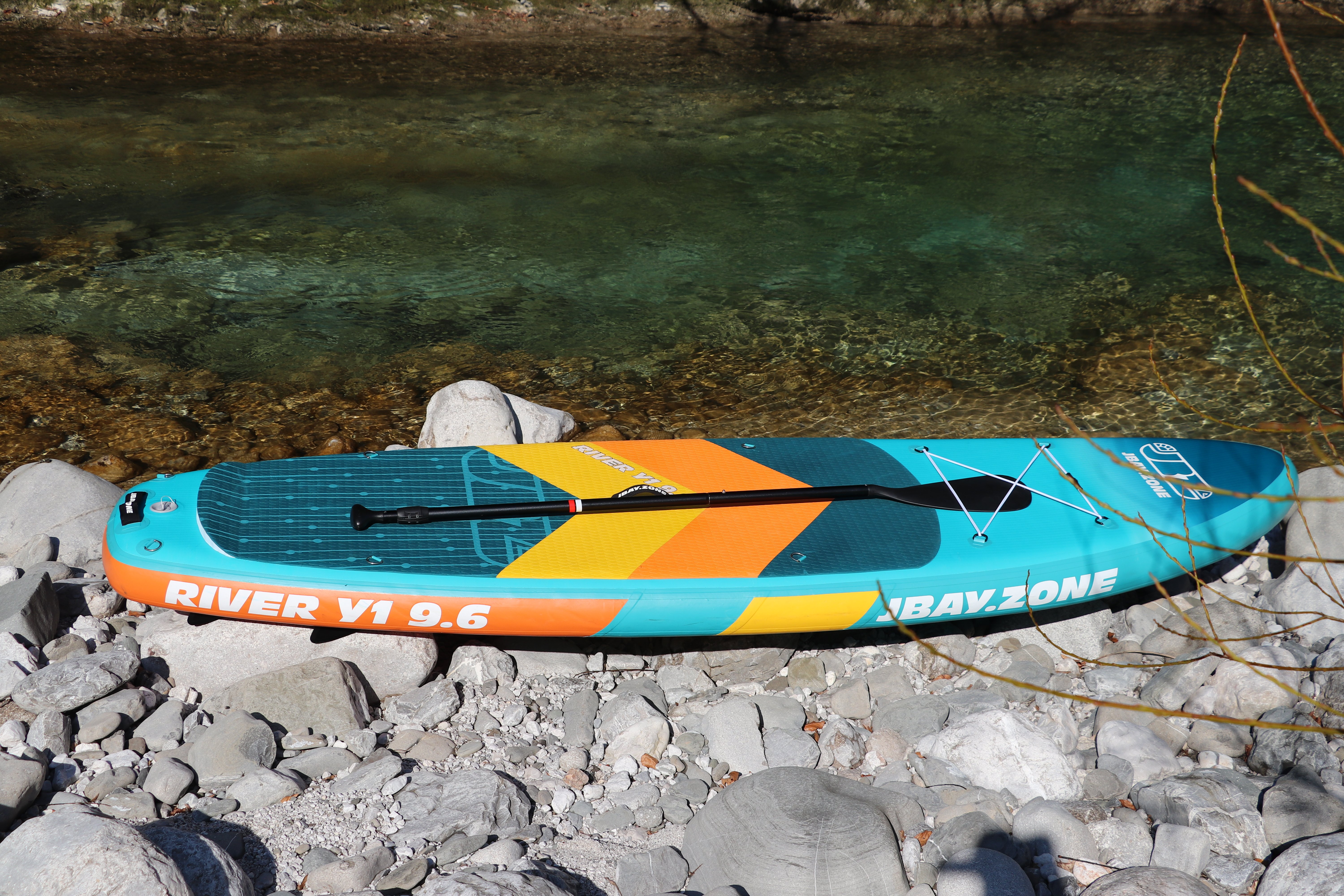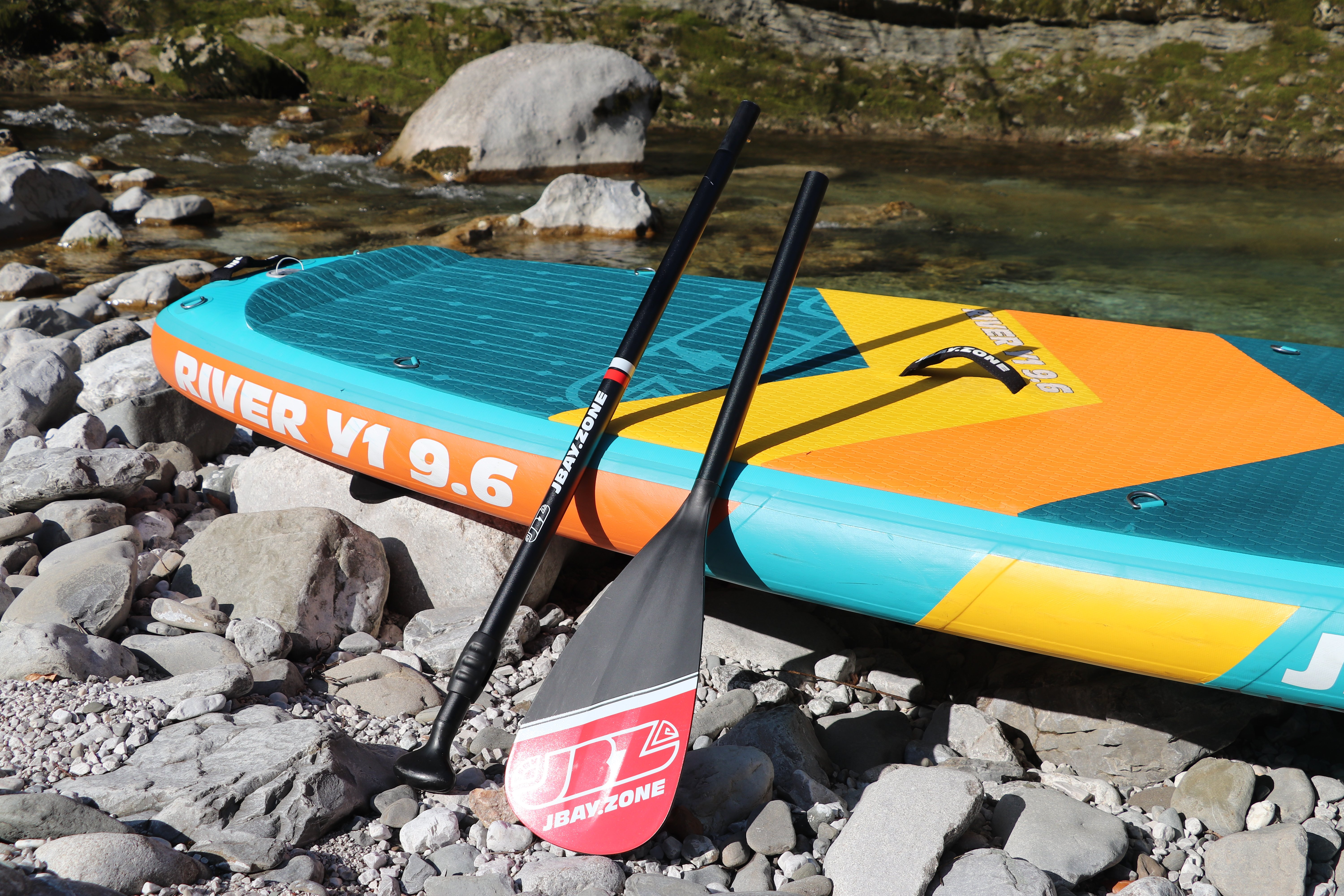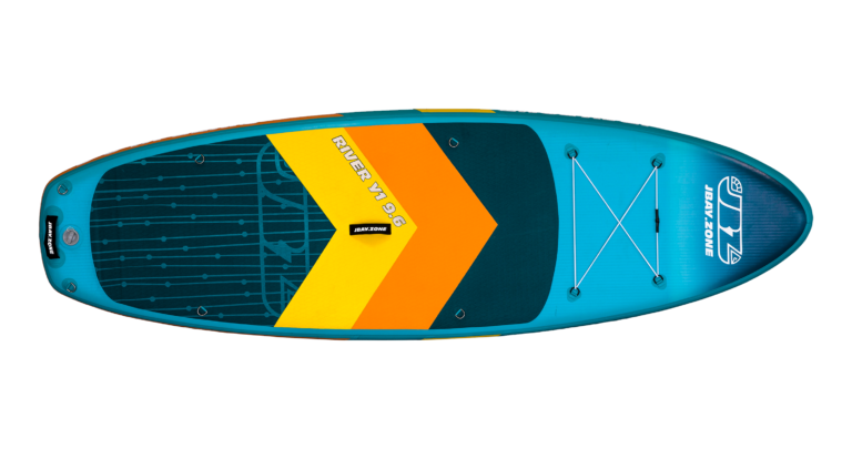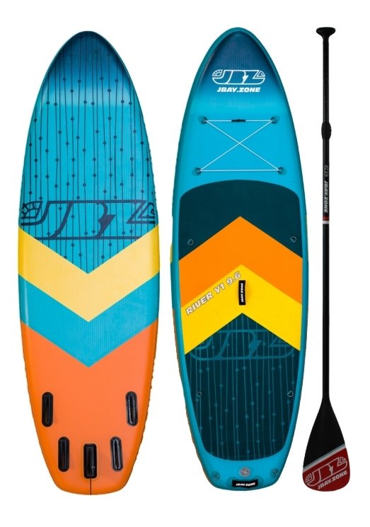 Stand-up paddling on the river offers the opportunity to explore wild, often inaccessible places. Paddling downstream provides a very rewarding adrenaline experience.This is why JBAY.Zone designed the Whitewater River Y1 SUP specifically for paddling down the river.Whether you choose to paddle leisurely, enjoying the view while letting the river carry you along, or faster and facing a gentle current, the experience will be unforgettable. Riding a Whitewater SUP River Y1 paddleboard is also a great way to keep fit. SUP training is good for different areas of the body and even the brain. Exploring otherwise inaccessible places and reconnecting with nature helps us clear our minds of thoughts and relax.The Whitewater River Y1 SUP has a wide, 35'' (89 cm) deck that helps you balance, paddle and let the current carry you along. That's because most of the paddleboard is covered in non-slip EVA foam.Five stabilizing fins, four fixed quadrifin side fins and one removable center fin, are ideal for controlling the board best in light or moderate current. Its speed is also good due to the 9'6'' (290 cm) deck length. The main technology we use in our inflatable SUP boards is 2LF - Fusion Technology.The two overlapping layers of high strength PVC laminate, pictured (E) and (F), are thermally bonded without the use of adhesive. Thermal welding thus ensures that our stand-up paddles are up to 25% lighter than standard inflatable boards.In other words, inflatable SUP boards made from 2LF are significantly stronger, stiffer and more durable. In addition, thermal bonding is more environmentally friendly because it eliminates the residual chemicals and solvents that would otherwise be used in conjunction with the adhesive.The core of our boards uses proven Drop-Stitch technology, pictured (D), which provides stiffness and weight support when the SUP is inflated thanks to thousands of textile fibers welded to the ends of the PVC laminate.The rails reinforced with a double layer of laminated PVC, shown in (A) and (B), make our paddleboards even safer and more stable.In the case of double-chamber SUPs, the second inner tube, shown in (G), is inserted inside the main tube and surrounds it on all sides. This second chamber provides an additional buoyancy surface, which is particularly useful for dealing with any emergency situations that may arise when using a Stand-up Paddleboard.Basic Parameters:Height: 15 cm Width: 89 cm Length: 290 cm Displacement: 295 litresMax pressure: 18/20 psi/1.24BarLoad capacity: up to 140 KgWeight: 12 kgEAN: 8056518103025 Included: - Pump: 2.0bar/ 29psi (double acting pump) Bravo (Hand Pump) Bravo® 2x2000cc special for SUP, ideal for high pressure valves with bayonet coupling. Single-Action Double-Action mode option)- Carrying bag: included (JBAY.ZONE Premium carrying bag is ideal for carrying the paddleboard and its accessories)- Fins: Detachable fins- Repair kit: Included (Handy repair kit with laminated PVC patch (does not contain glue) for minor repairs to punctures or damage to the outer layer of material)- Paddle: Expandable aluminum shaft 165-215 cm (JBAY.ZONE Red Edition adjustable aluminum paddle with polypropylene blade measuring 83 SQ.IN - 535 cm2. The modular handle can be extended by 50 cm.)- Lightweight and extremely strong safety "leash" JBAY.ZONE. Maximum length when extended 300 cm. JBAY.ZONE® manufactures and distributes inflatable Stand Up Paddle boards designed by SUP fans for SUP fans ??, for those who never give up their morning "Suppata", for those who want to enjoy the sunset in the middle of the sea with their loved ones, and for those who look forward to a weekend spent with friends and enjoy the breathtaking views that lakes or rivers can offer. All the effort that JBAY.ZONE® has put into the creation of its SUP boards (Paddleboards) is therefore for everyone who loves the outdoors, likes to share experiences and wants to be together, have fun and keep fit.