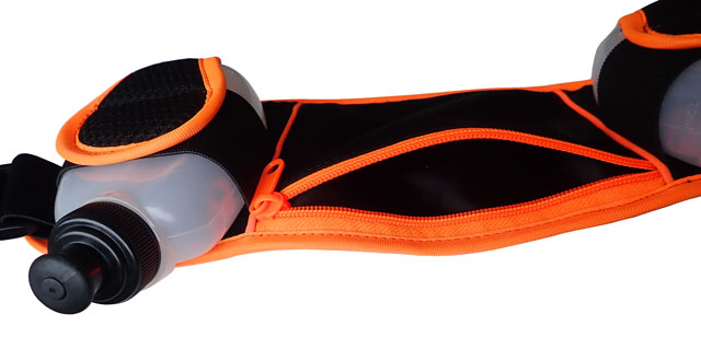 Sports kidney with 2 x 0.2 l beverage bottles and storage space for MP3 player + headphone hole. The size of the inner pocket is approx. 12 x 9 cm.