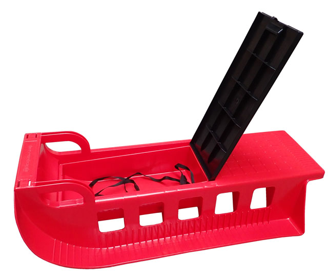 All-wood sledge with textile strap on the seat and metal skids. Length 105 - 110 cm, designed for recreational sport.