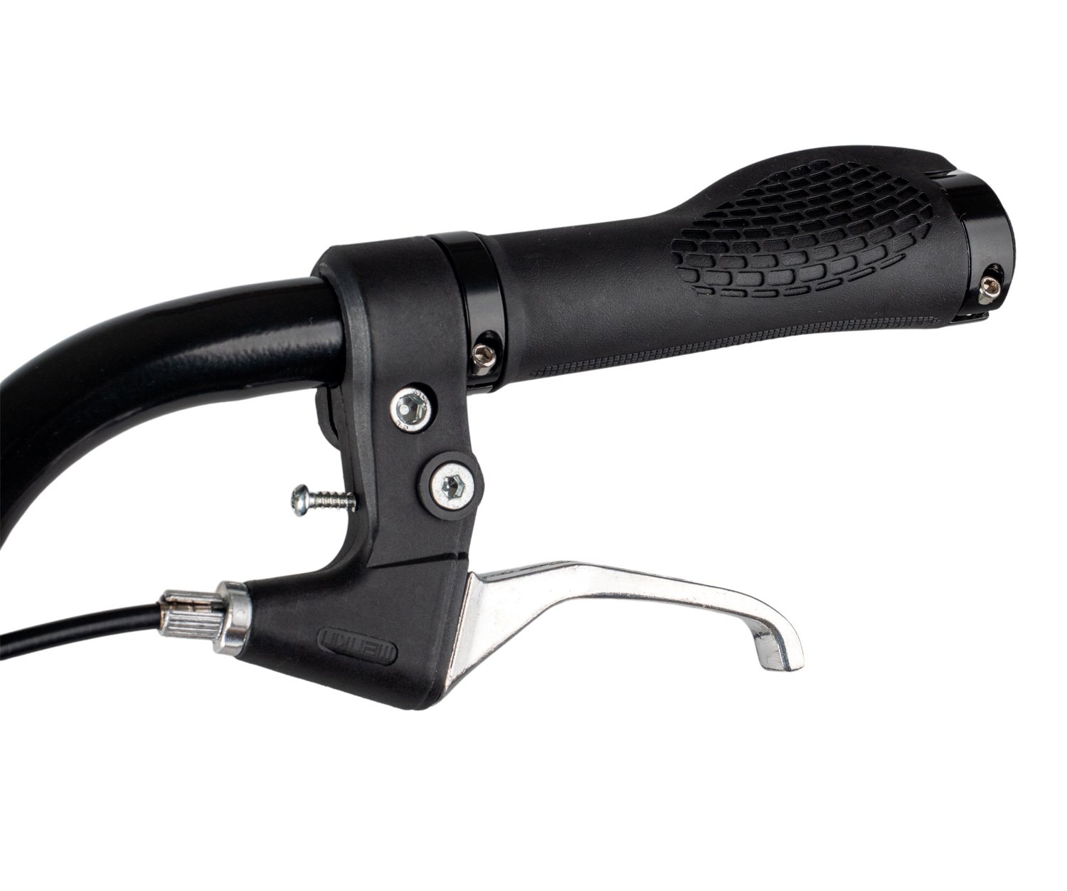 The scooter handlebars are solid, recommended for heights up to 170 cm and have rubber grips and horns on the handlebars
