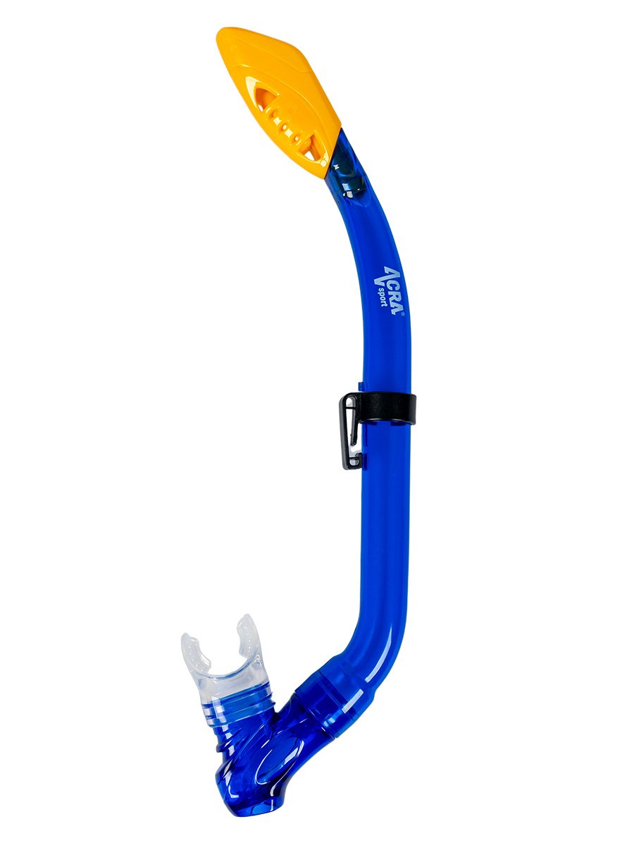 Top Dry Snorkel with Valve and ClipDry snorkel with splash-proof design, the advanced anti-splash system of the ACRA SPORT diving kit for kids prevents water from entering the snorkel and the vent valve allows water to be cleaned and drained from the snorkel. A simple clip makes it easy to attach the dry snorkel to your maskSoft mouthpiece made of food-grade siliconeDesigned exclusively for kids, the snorkel features an ergonomically shaped mouthpiece for added comfort and reduced jaw fatigue and a one-way valve for quick and easy water clearing.