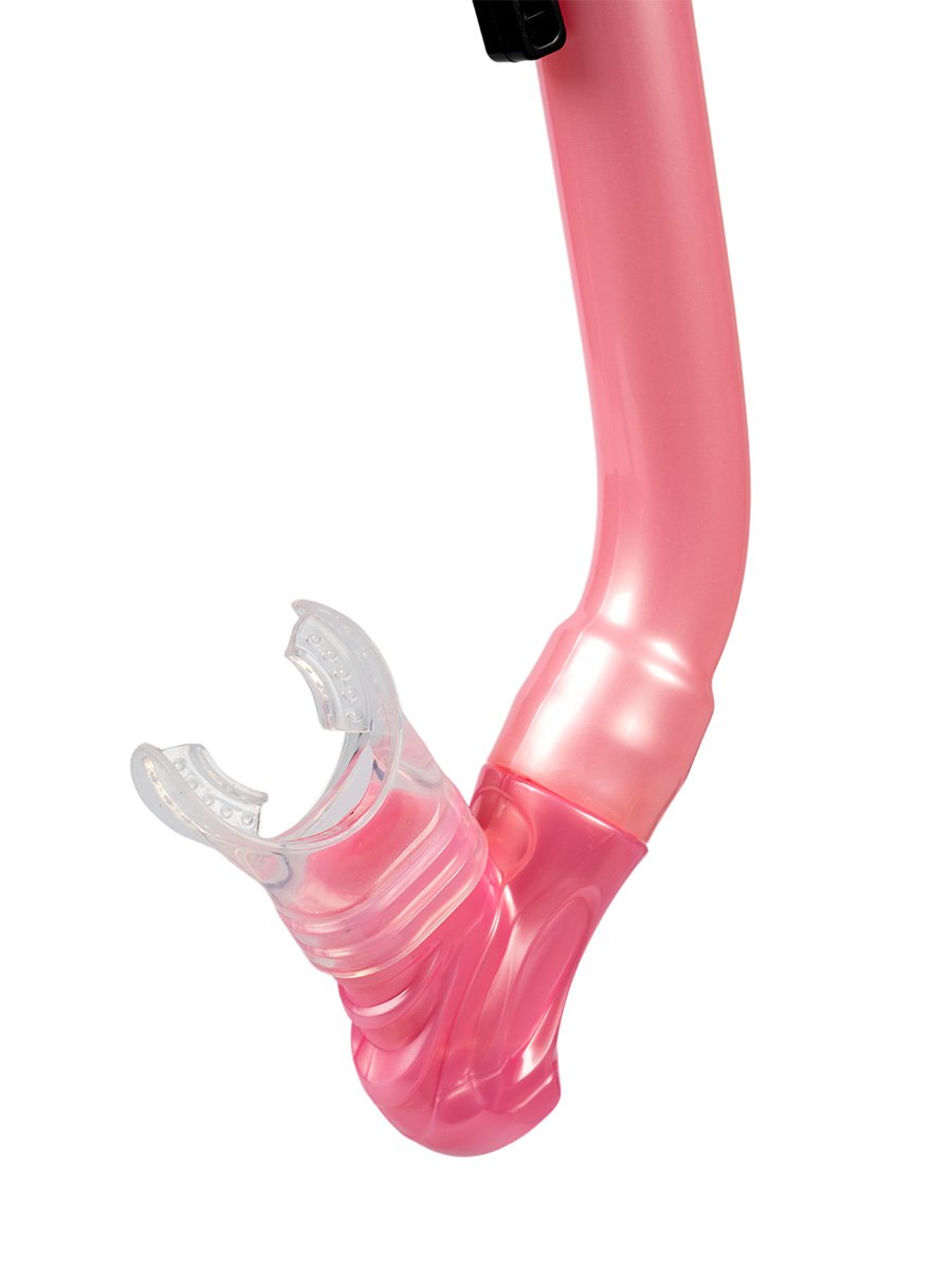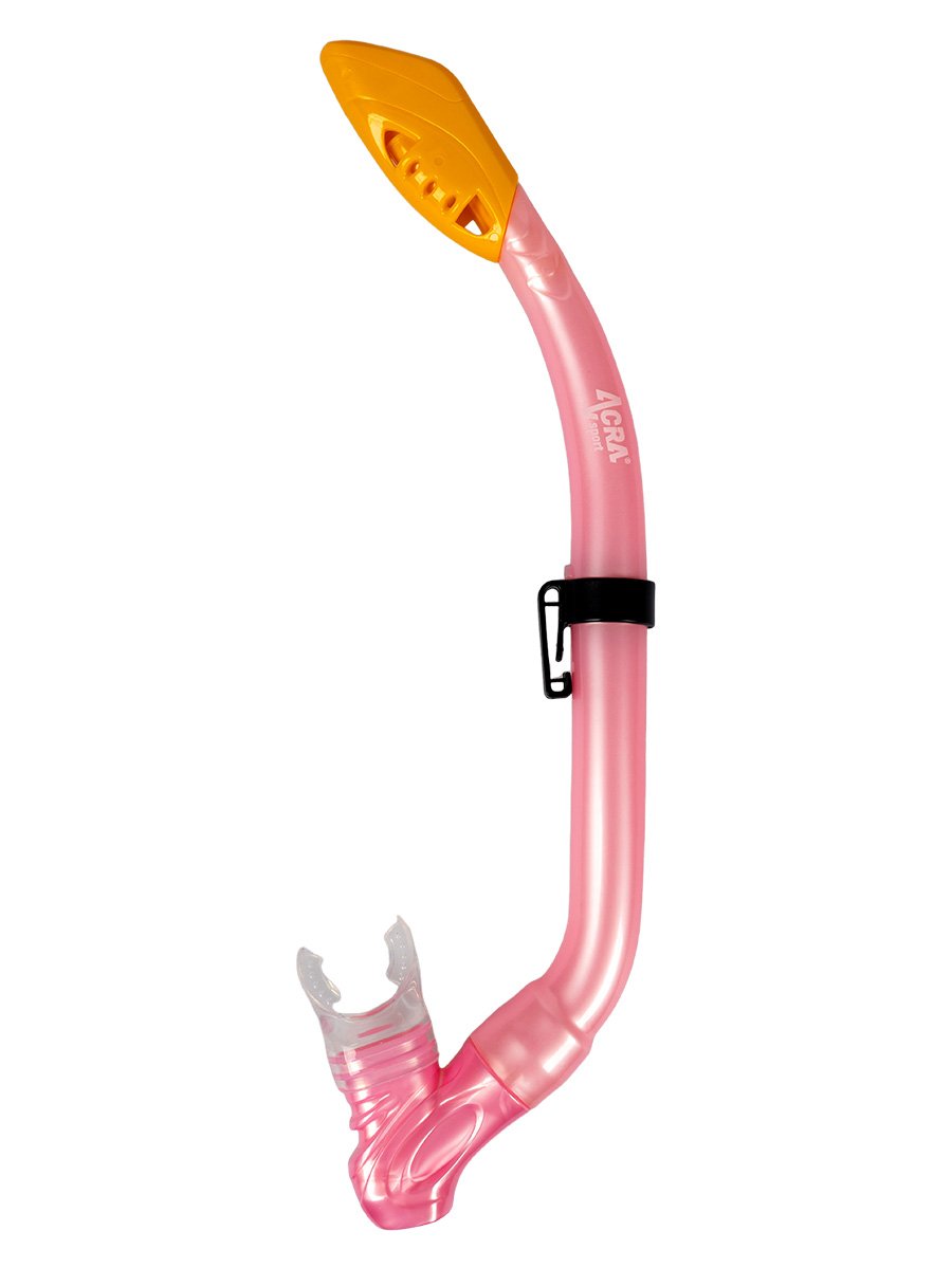 Top Dry Snorkel with Valve and ClipDry snorkel with splash-proof design, the advanced anti-splash system of the ACRA SPORT diving kit for kids prevents water from entering the snorkel and the vent valve allows water to be cleaned and drained from the snorkel. A simple clip makes it easy to attach the dry snorkel to your maskSoft mouthpiece made of food-grade siliconeDesigned exclusively for kids, the snorkel features an ergonomically shaped mouthpiece for added comfort and reduced jaw fatigue and a one-way valve for quick and easy water clearing.