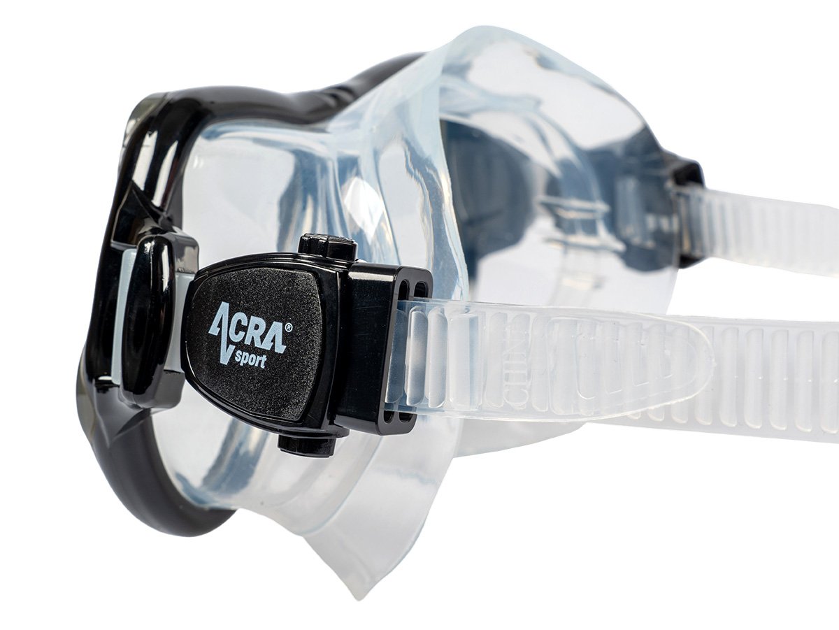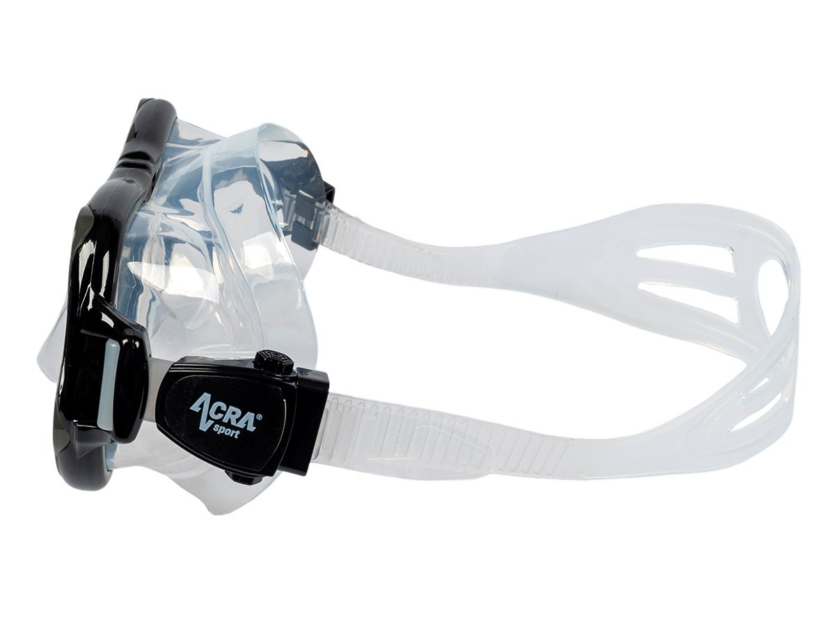 Snorkel snorkel mask with panoramic view: 180° HD Panoramic view with ANTIFOG treatment. Constructed of four panoramic view windows with a tempered glass lens and hypoallergenic silicone liner, the Acra Sport snorkel mask withstands underwater pressure while diving and snorkeling and offers maximum comfort. The diving mask's hem is made of soft and flexible silicone, and the food-grade silicone mouthpiece is secure, creating a watertight seal with each driver's face and attaching perfectly to the mouth with no particular odor.