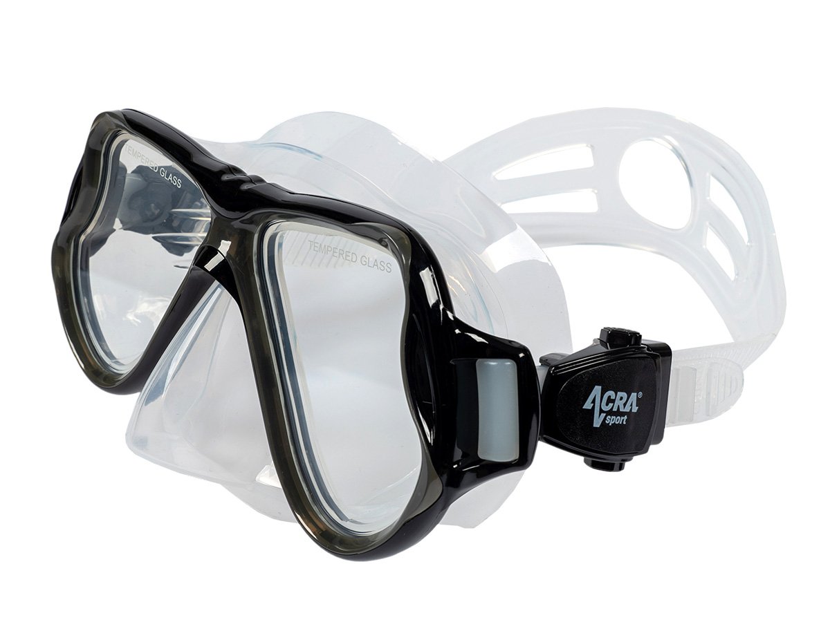 Snorkel snorkel mask with panoramic view: 180° HD Panoramic view with ANTIFOG treatment. Constructed of four panoramic view windows with a tempered glass lens and hypoallergenic silicone liner, the Acra Sport snorkel mask withstands underwater pressure while diving and snorkeling and offers maximum comfort. The diving mask's hem is made of soft and flexible silicone, and the food-grade silicone mouthpiece is secure, creating a watertight seal with each driver's face and attaching perfectly to the mouth with no particular odor.