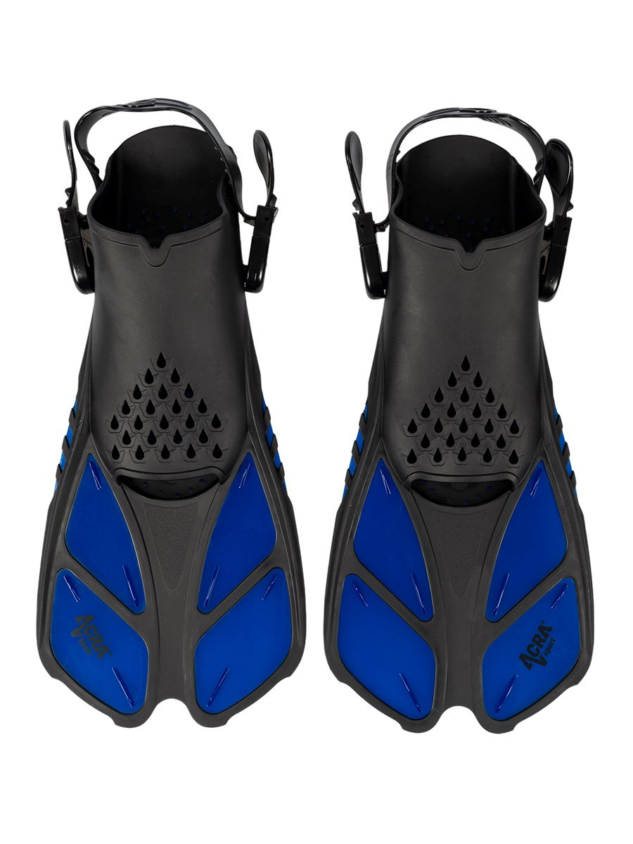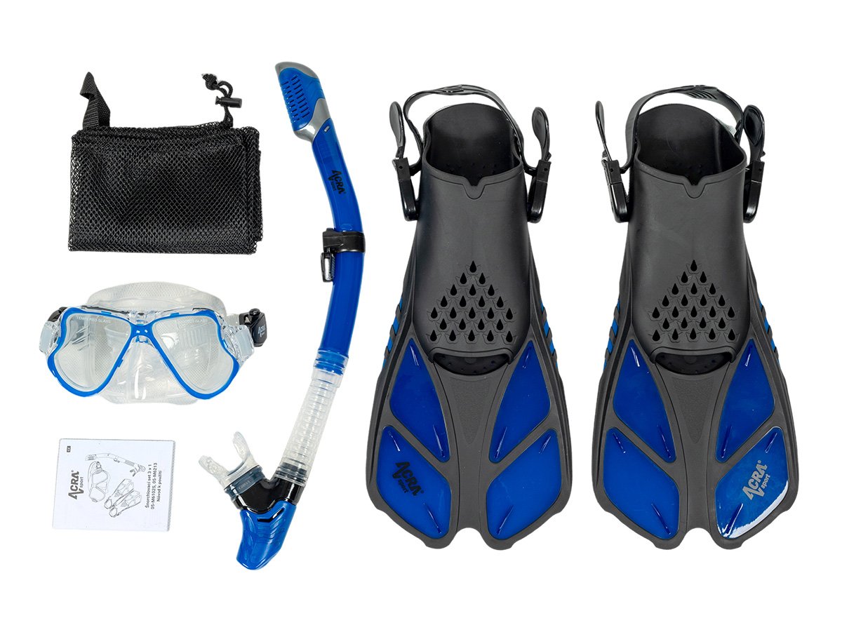Acra Sport snorkel set with adjustable fins, tempered glass mask with two visors, Dry Top silicone snorkel and travel gear bag. The Acra snorkel set is the perfect travel companion and is suitable for snorkeling, swimming, diving and much more.