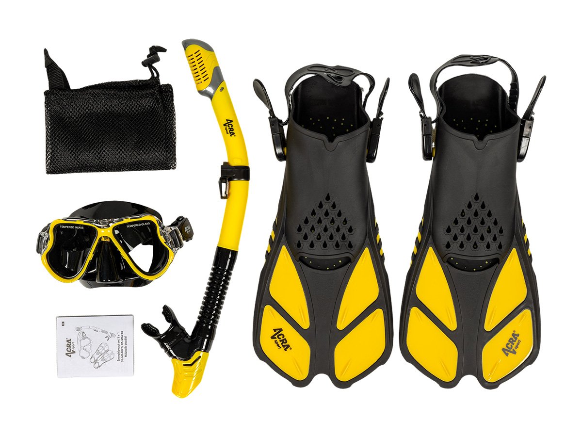Acra Sport snorkel set with adjustable fins, tempered glass mask with two visors, Dry Top silicone snorkel and travel gear bag. The Acra snorkel set is the perfect travel companion and is suitable for snorkeling, swimming, diving and much more.