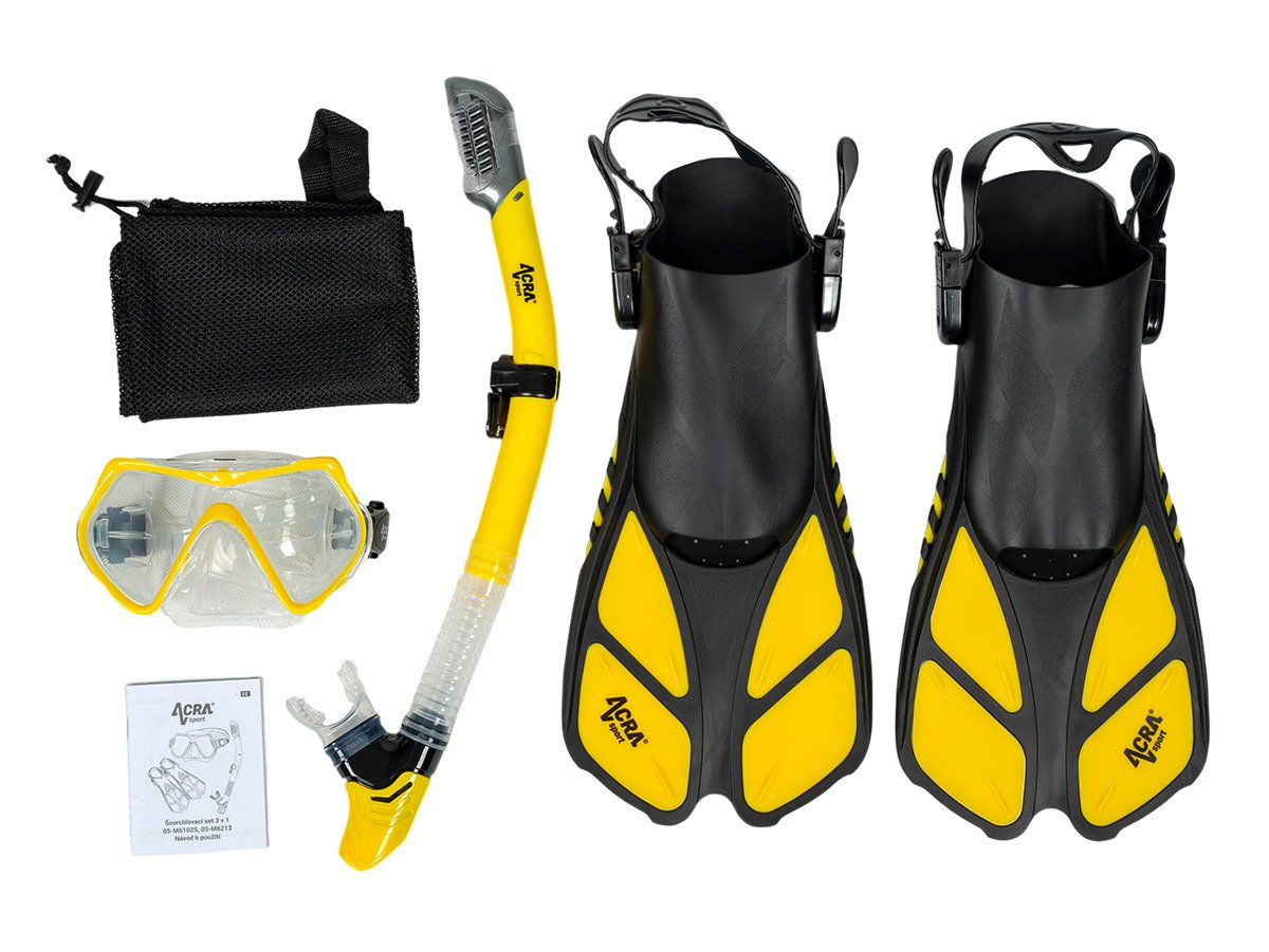 Acra Sport snorkel set with adjustable fins, tempered glass mask with two visors, Dry Top silicone snorkel and travel gear bag. The Acra snorkel set is the perfect travel companion and is suitable for snorkeling, swimming, diving and much more.