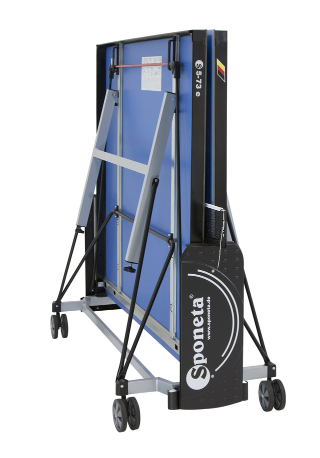 Table tennis table Sponeta S5-73 e in blue for outdoor use. This is a quality that is comparable to classic tables with wooden tops for indoor use. The galvanized frame together with the 6 mm thick melamine plastic top, which has the properties of a classic wooden top, allow the table to be permanently placed outdoors (however, we recommend leaving the table outside only from spring to autumn to prolong its life - snow and ice can mechanically damage the table), regardless of the current weather conditions. The table is of such high quality that we offer an extended warranty of 3 years. The table can be folded without having to dismantle the net holder with net. The advantage of this model is that the boards can be folded from only one side, and there is no need to walk around the table or have additional help. The solid frame made of 5 x 5 cm profiles gives the table a great stability equal to indoor tables. The table legs are fitted with plastic screws to compensate for uneven ground. The table also includes a high quality net holder and net. The 4 rubberised castors with a diameter of 128 mm allow for quiet running and make the table easy to handle. The dimensions of the table are 274 x 152,5 x 76 cm when unfolded, the total width when folded for handling is 153 cm (184 cm including the retained net holders) x 65 cm x 155 cm including the height of the castors. The table includes a holder for 2 bats and 4 balls. The weight of the table is 74 kg, 78 kg with packaging. Available in BLUE.