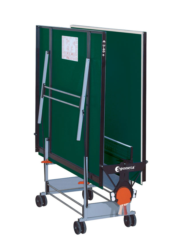Table tennis table Sponeta S3-46 e, outdoor. The galvanized frame together with the 5 mm thick melamine plastic board, which has the properties of a classic wooden board, allow the table to be permanently placed outdoors ((however, we recommend leaving the table outdoors only from spring to autumn to prolong its life - snow and ice can mechanically damage the table) regardless of the current weather conditions. The table is of such high quality that we offer an extended warranty of 3 years. The table can be folded without having to dismantle the net holder with net. The solid frame made of 2,5 x 2,5 cm profiles gives the table a great stability equal to indoor tables. The high quality net holder and net have better performance than the cheaper model of the S1 series outdoor table. Both are included in the product. The castors that allow the table to roll make it easy to handle. Table dimensions 274 x 152.5 x 76 cm unfolded, overall width when folded for handling is 153 cm (184 cm including retained net holders) x 65 cm x 189 cm including height of castors. The table includes a holder for 2 bats and 4 balls. The weight of the table is 62 kg, 66 kg with packaging. Available in GREEN. Carton size 157 x 140 x 9,5 cm