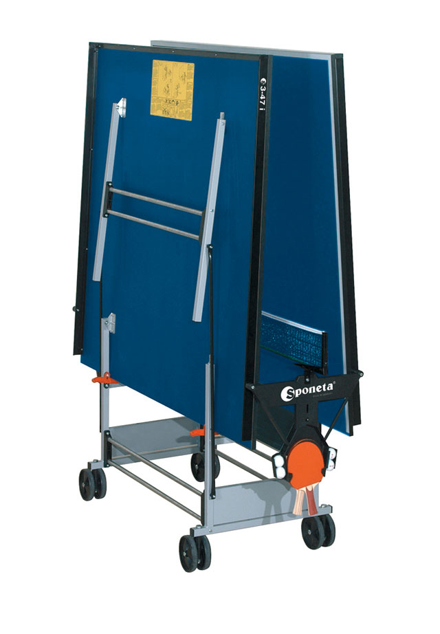 Ping pong table Sponeta S3-47i is a quality table designed for training purposes or for more demanding recreational players. The table is of such high quality that we provide an extended warranty for 3 years. The table is designed for indoor use. It has a sanded surface on a 19 mm thick board. This board already guarantees consistent performance for recreational play at a higher level. The board is reinforced with a 36 mm steel frame, which strengthens the table even further. The table legs are made of steel. The table is reinforced with metal rods. The inner part of the table is equipped with four castors for handling when folded. In the middle of the table there is a holder for bats and balls. A net and net holder is included with the table. The packaging of the table is in a carton, the weight of the table is 75 kg, the weight including packaging is 79 kg. The dimensions of the table are 274 x 152,5 x 76 cm when unfolded, the total height when folded for handling is 153 (184 cm including the retained net holders) x 65 cm x 189 cm including the height of the castors. The dimensions of the packed table are 162 x 144 x 11,5 cm.Available in BLUE.