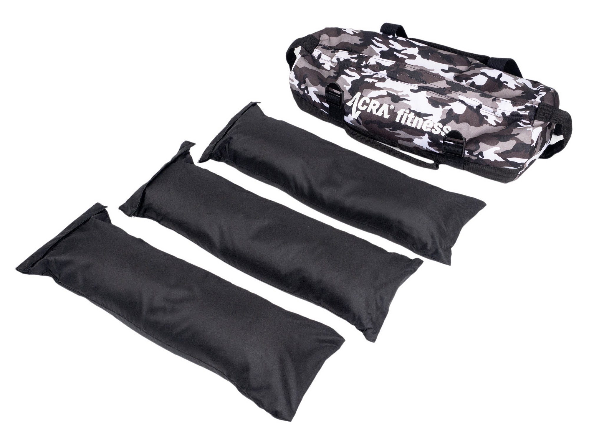 Acra Adjustable Fitness Bag, 20 kgAdjustable fitness weight bag allowing for individual customization of workouts through innovative design. Includes sand-filled weight bags that can be individually removed. Each bag weighs 6.5 kg for a total of 20 kg. The opening of the bags is fitted with a high quality Velcro fastener to protect the sand. The bag has four padded handles for a comfortable and safe workout, quality nylon reinforcement with double stitching for added durability, and a handy zipper for easy addition or removal of weight.
